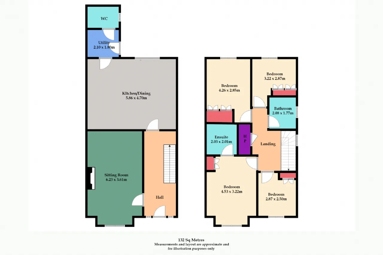 Presented in excellent condition throughout the property extends to 132 sq. m approx. with accommodation comprising entrance hallway, sitting room, kitchen/dining room, utility, guest wc, 4 bedrooms all with fitted wardrobes (1 en-suite) and a family bathroom.