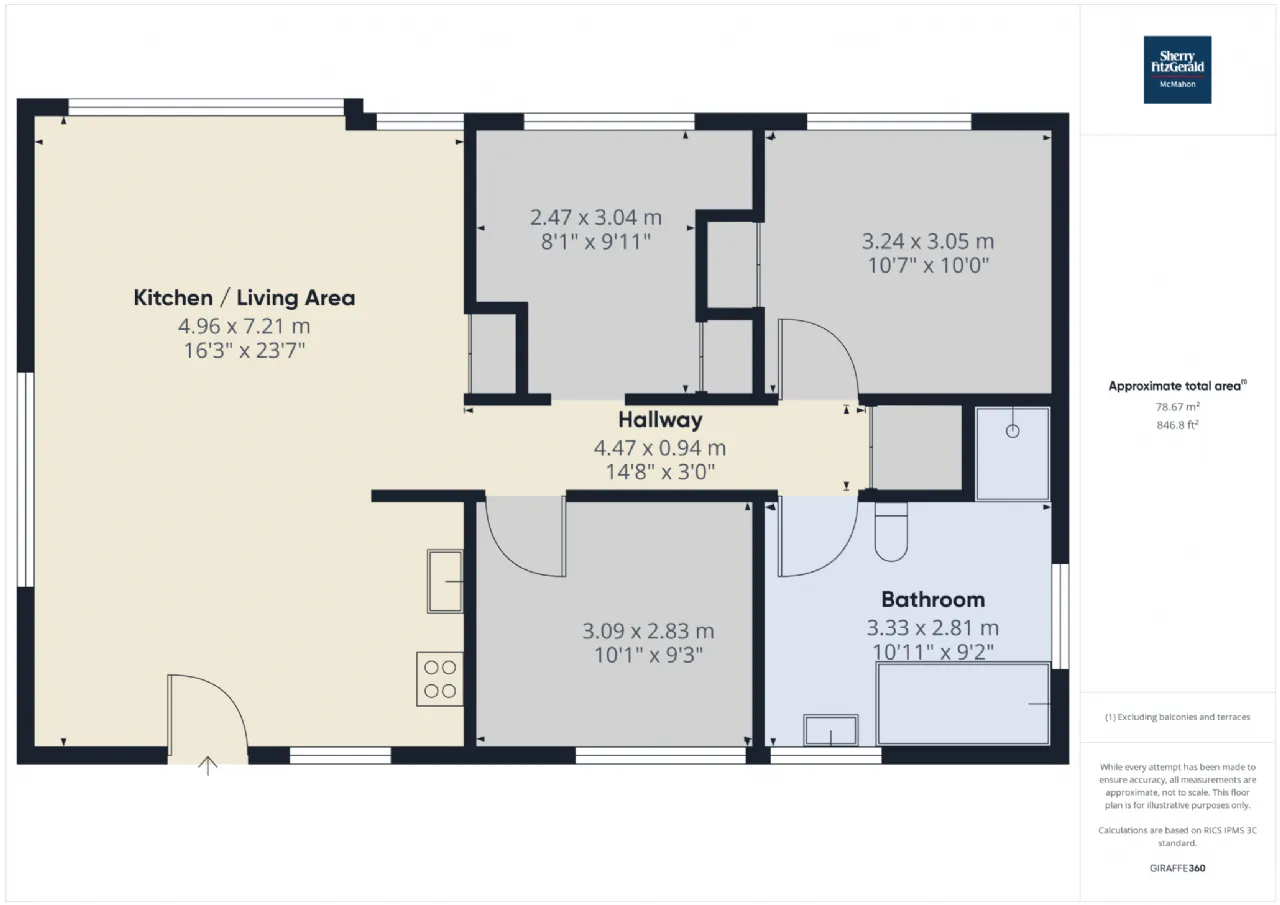 Accommodation comprises a floor area of 82.3 sq.m. and includes an open plan kitchen/living and dining area, bathroom and 3 bedrooms.