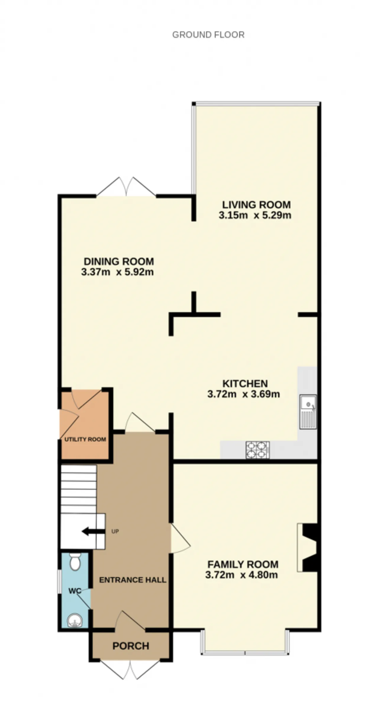 Family Room 3.72m x 4.80m From the entrance hall, you walk into the inviting family room. This room features a large bay window at the front of the home offering a wealth of natural light, solid wood flooring, an open fireplace with solid wood surround and overhead lighting.