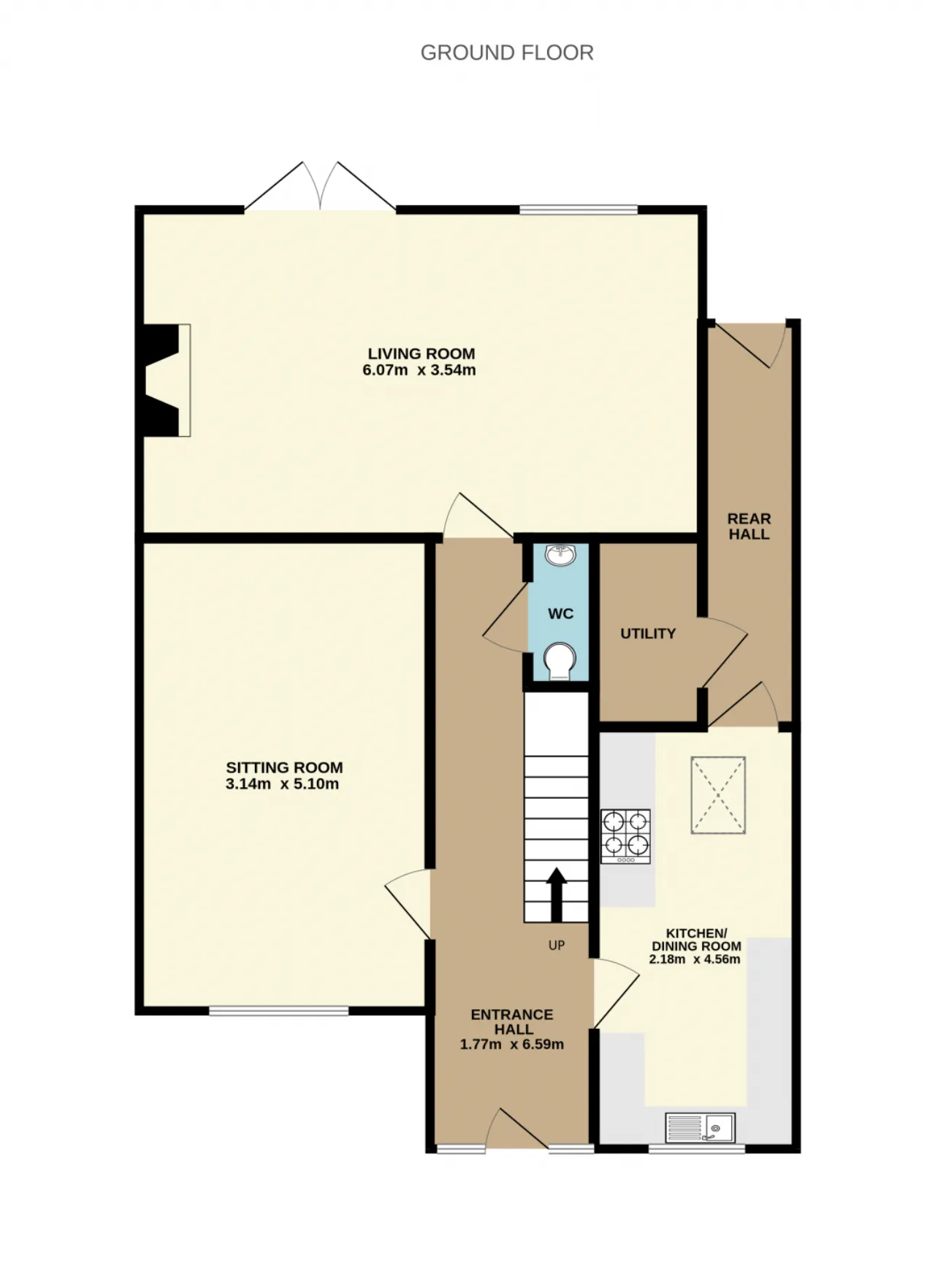 Living Room 6.07m x 3.54m A generously proportioned room to the rear of the home, featuring an ornate open fireplace with a cast iron surround. The space is enhanced by carpet flooring and elegant cornicing, while French double doors open onto the patio and gardens, which enjoy a desirable southerly aspect.