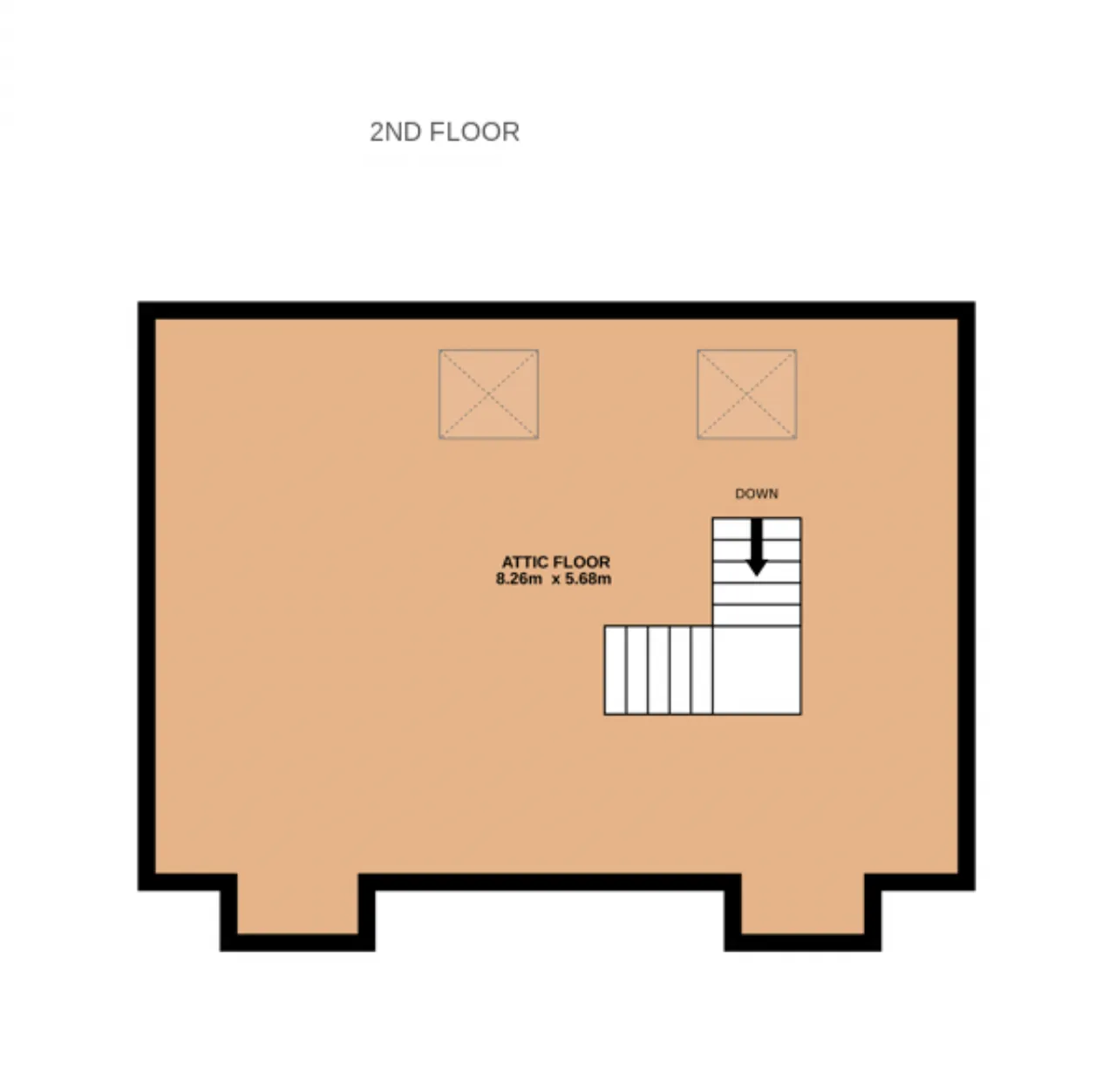 Attic Room 8.26m x 5.68m Large open plan area with very high ceiling space - carpet flooring, light fitting, velux windows with black out blinds. Extra eaves space.