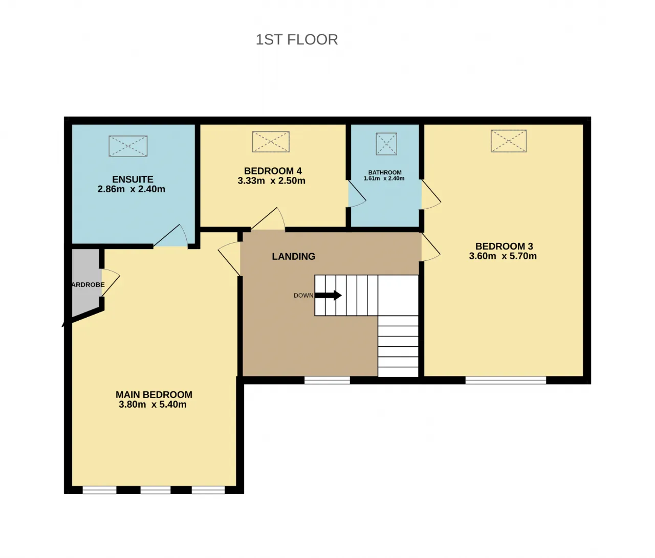 Landing 3.6m x 2.9m A bright and open space featuring a split-level staircase leading back downstairs. A large front-facing window fills the area with natural light, while the landing provides access to all first-floor rooms.