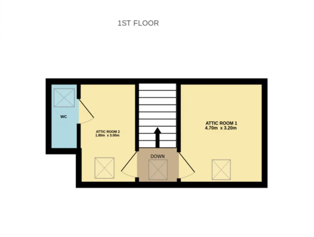 Attic room 2 3.0m x 1.8m Currently used as a home office, this versatile attic room features timber flooring and provides access to an adjacent 2-piece WC with toilet and sink.