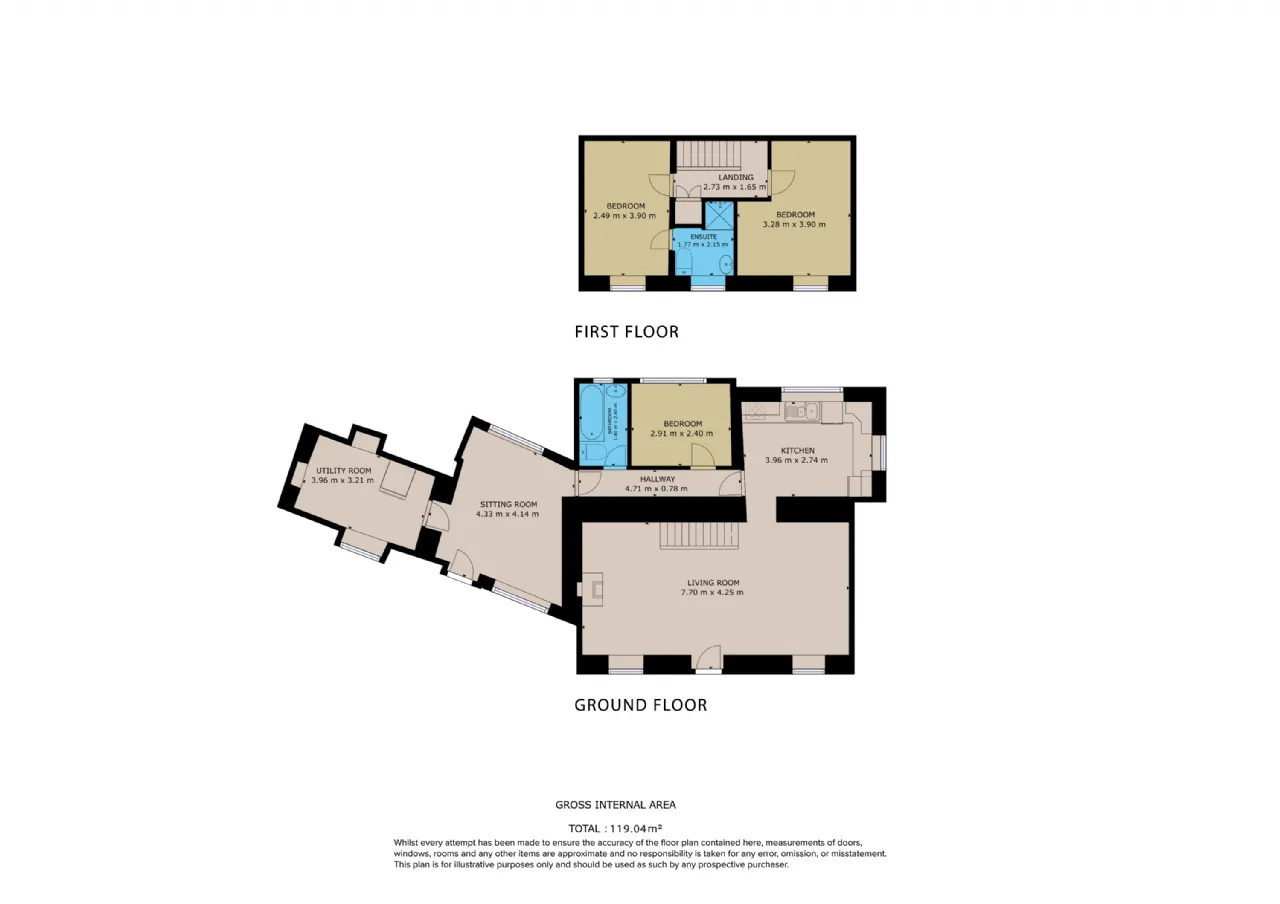 The ground floor accommodation comprises a bright and functional kitchen, a comfortable living room, a separate sitting room, a utility room, a bedroom and a family bathroom. Upstairs, there are two generously sized bedrooms, one of which benefits from an ensuite bathroom.