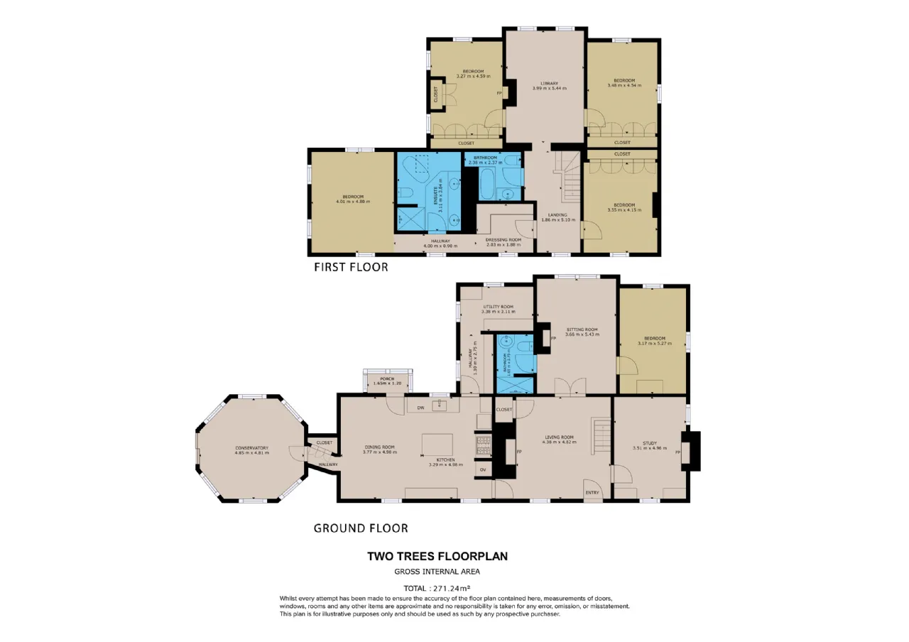 The ground floor features an en-suite bedroom, guest wc, and a practical store, while upstairs includes two more well-appointed bedrooms and a family bathroom. It can serve as a private guesthouse or be seamlessly integrated with the main home for expanded living. Grounds Two Trees and The Barn are set amidst beautifully landscaped grounds featuring mature trees, manicured lawns and natural hedging. A charming single-storey wooden cabin offers the perfect space for a studio, workshop, or creative haven.