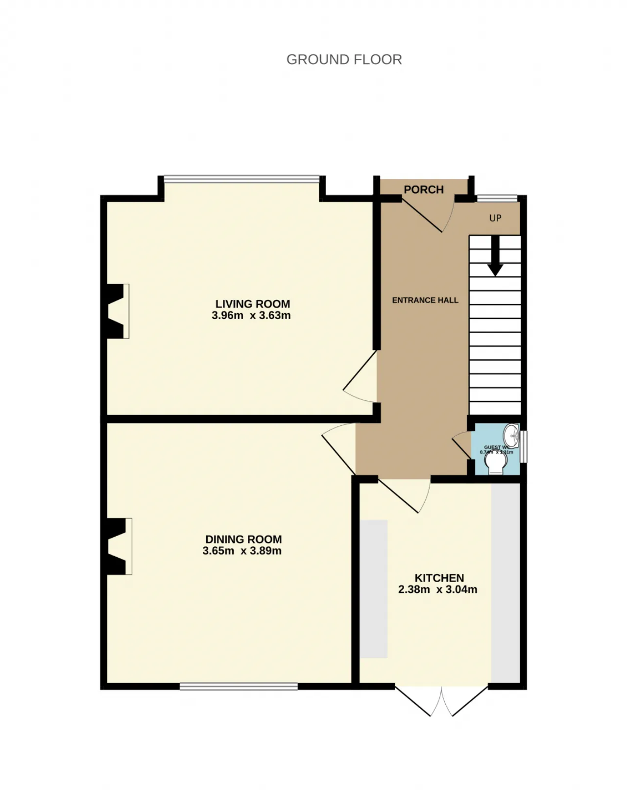 Guest W.C. 1.39m x 0.75m The fully tiled w.c. is separate to the bathroom. It features a frosted window to the side of the property.
