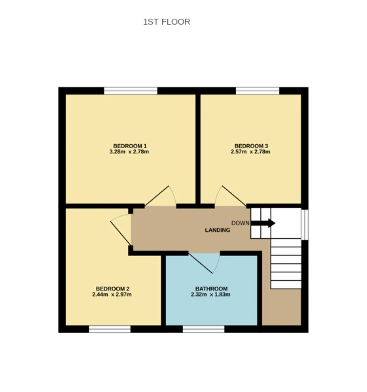 Landing 0.85m x 3.76m The landing gives access to the bedroom and bathroom accommodation. There is one window to the side allowing for natural light to flow in.