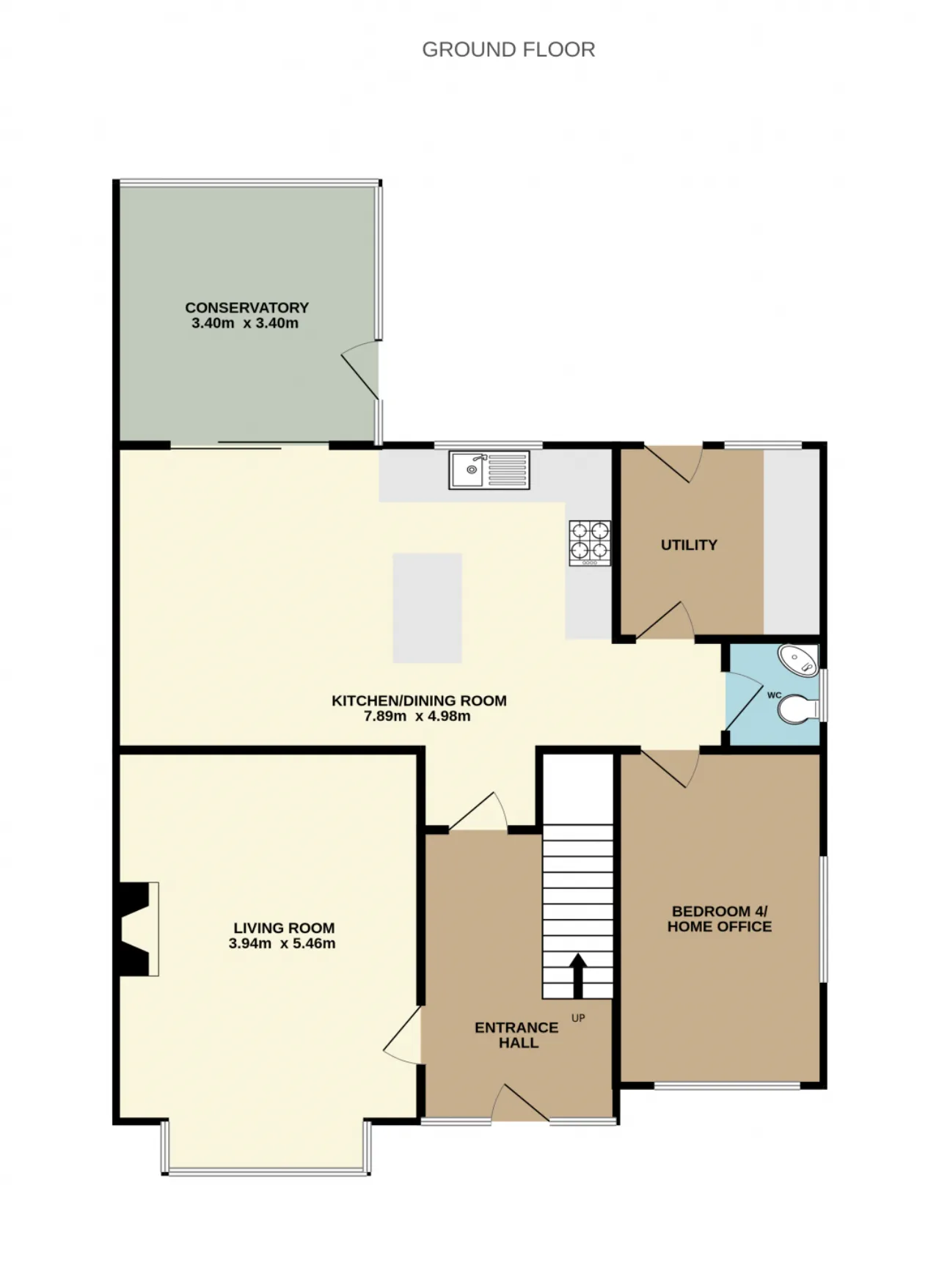 The ground floor also includes a versatile fourth bedroom, ideal as a home office or playroom if required, along with a utility room and a guest bathroom.