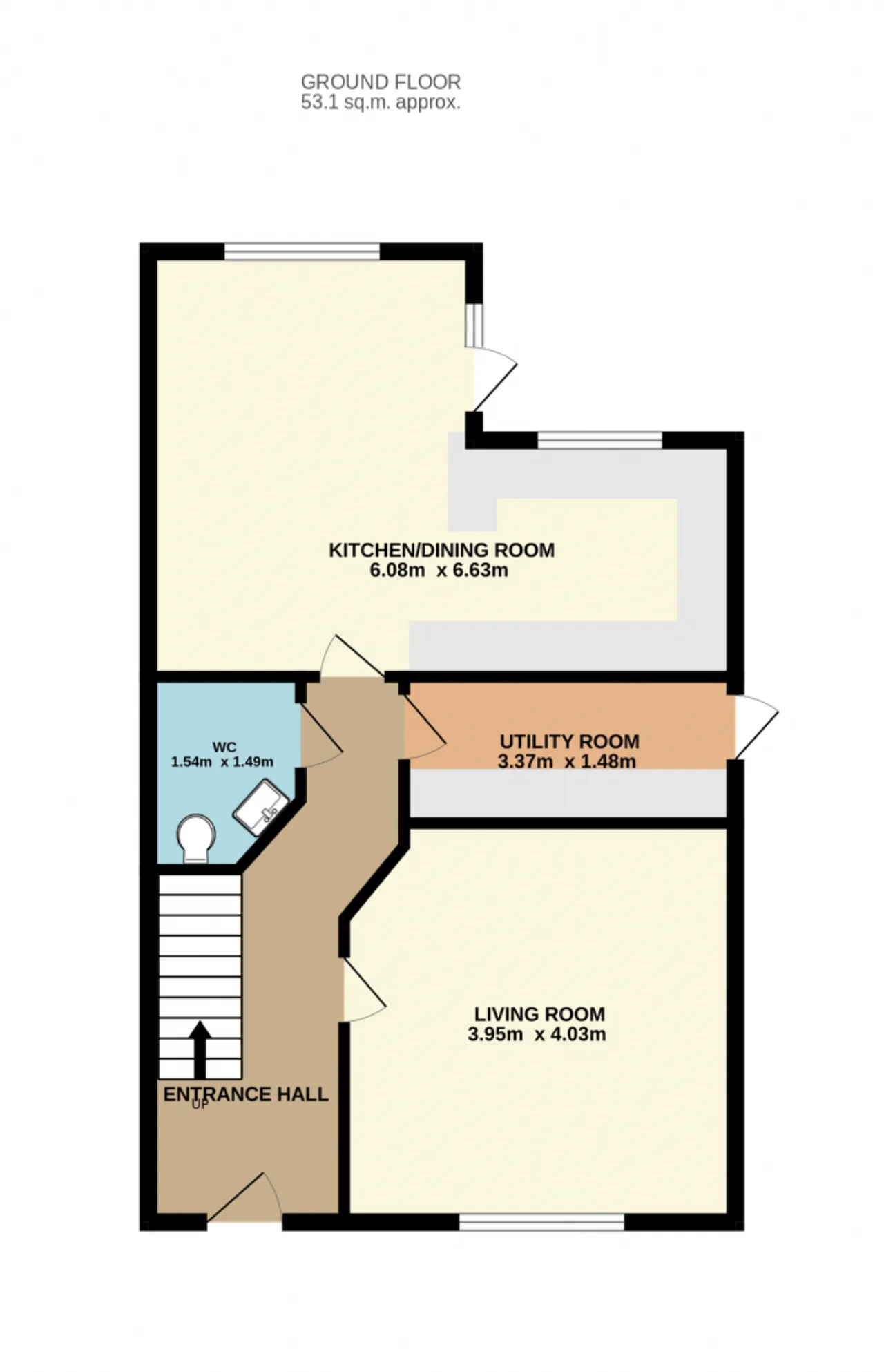 Guest WC 1.54m x 1.49m Located just off the entrance hall a stylish two-piece suite with fully tiled floor and walls.