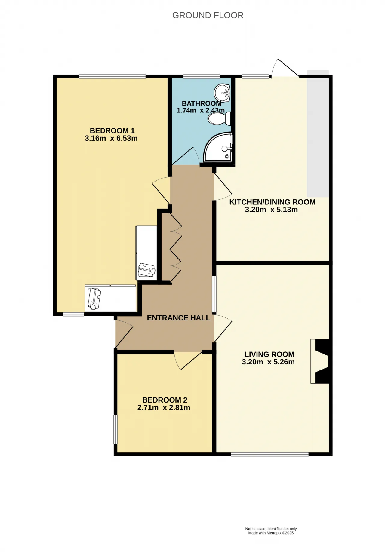 Bathroom 2.43m x 1.74m Three piece suite with fully tiled floor and walls, electric shower and heated towel rail.