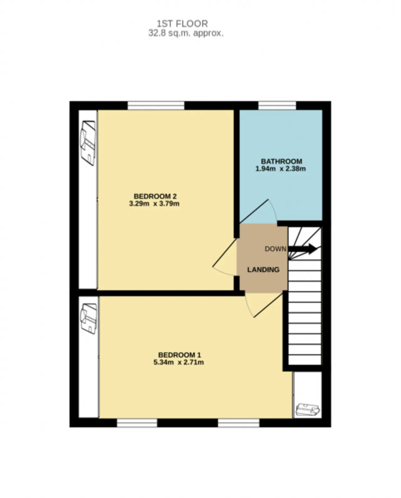 Bedroom 1 5.34m x 2.71m A front-facing bedroom with two windows, offering ample space and built-in wardrobe storage.