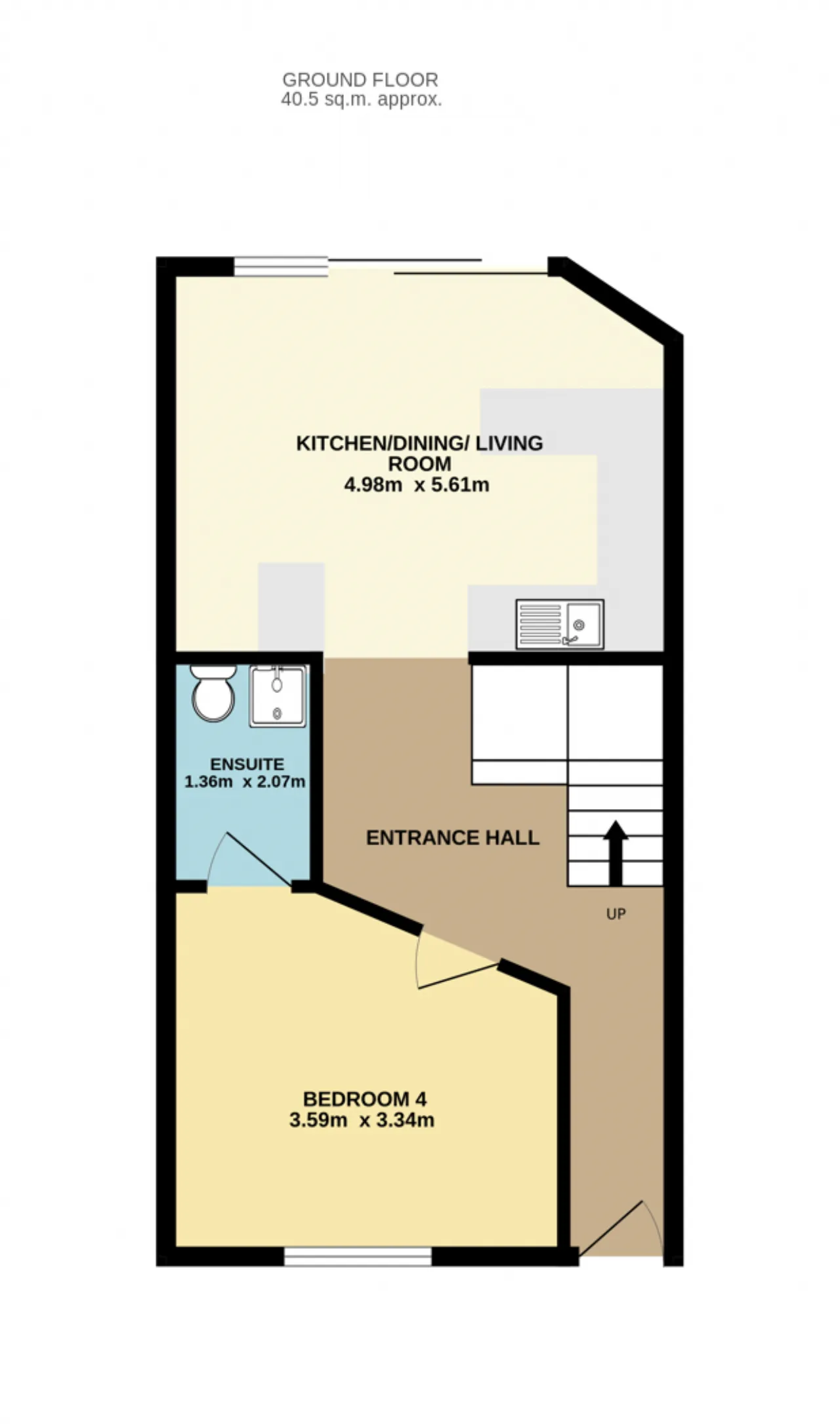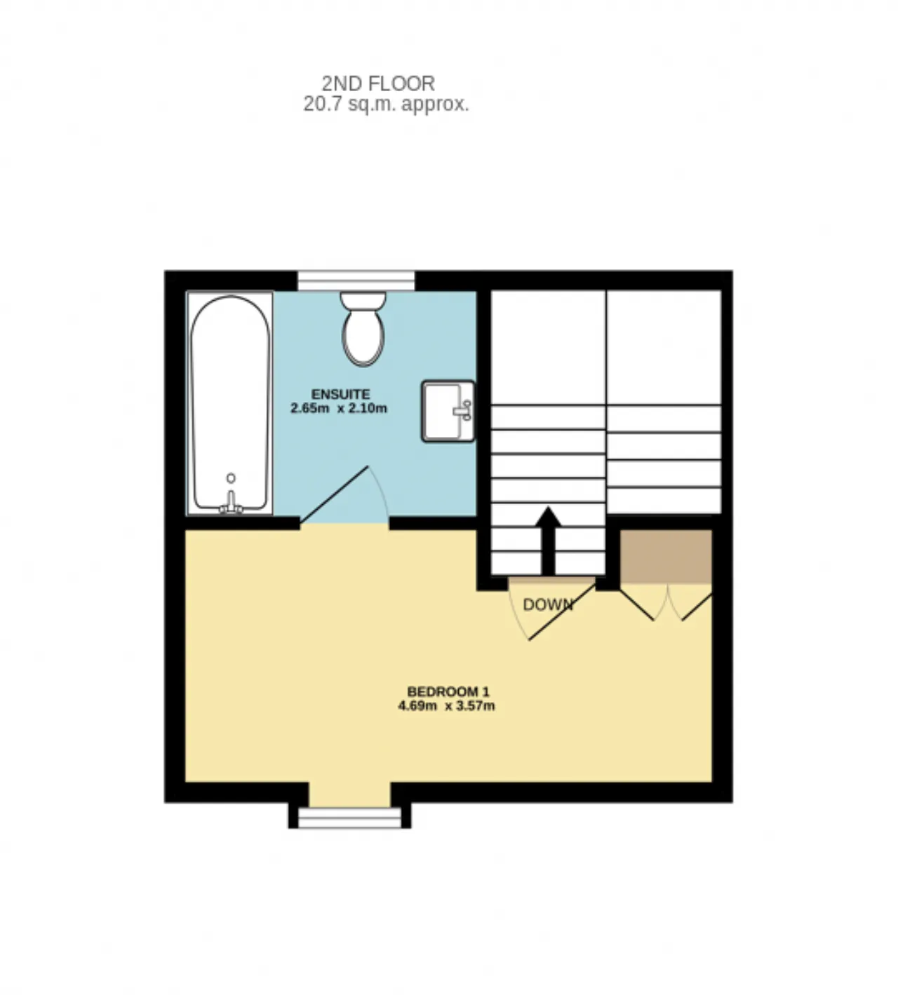 En-Suite 2.65m x 2.10m Quality three-piece bath suite, sink with under storage, tiled floor and shower splashback, velux window.