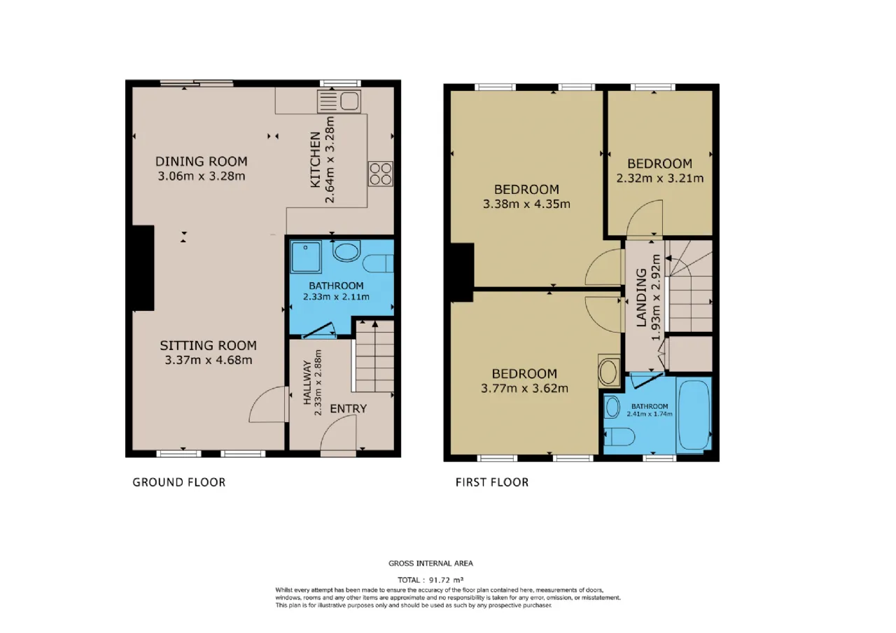 The accommodation extends to approximately 92 sq. m. / 990 sq. ft. and includes entrance lobby, shower room and open plan living-dining-kitchen on the ground floor. The first floor includes 3 bedrooms and a family bathroom.