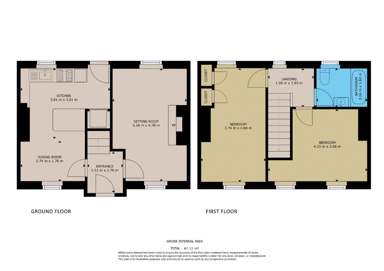 Upon entering the 67 sq.m. (721 sq.ft.) home, you are greeted by a welcoming entrance hall with tiled flooring and a carpeted staircase leading to the first floor. The sitting room is a warm and inviting space, featuring a stone fireplace and large windows facing east and west that allow natural light to flood the room, creating a bright and airy atmosphere.