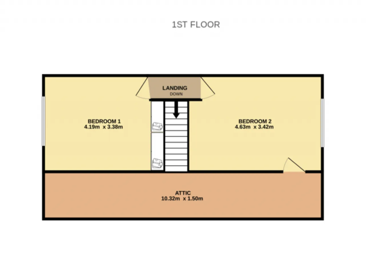 Landing 1.83m x 0.83m The carpeted stairs and landing gives access to two bedrooms and attic on the first floor.