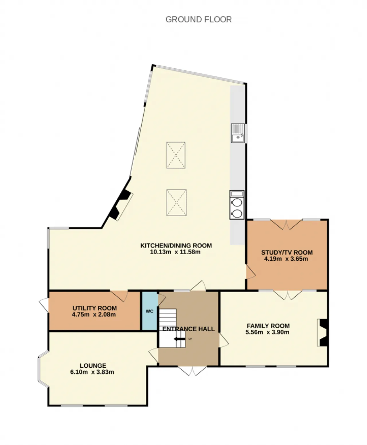 Utility Room 4.95m x 2.13m Excellent range of fitted floor and eye-level storage units, providing ample space for storage. Plumbed for washing machine, dryer and sink. Natural light flows through the glass panel door to side garden.