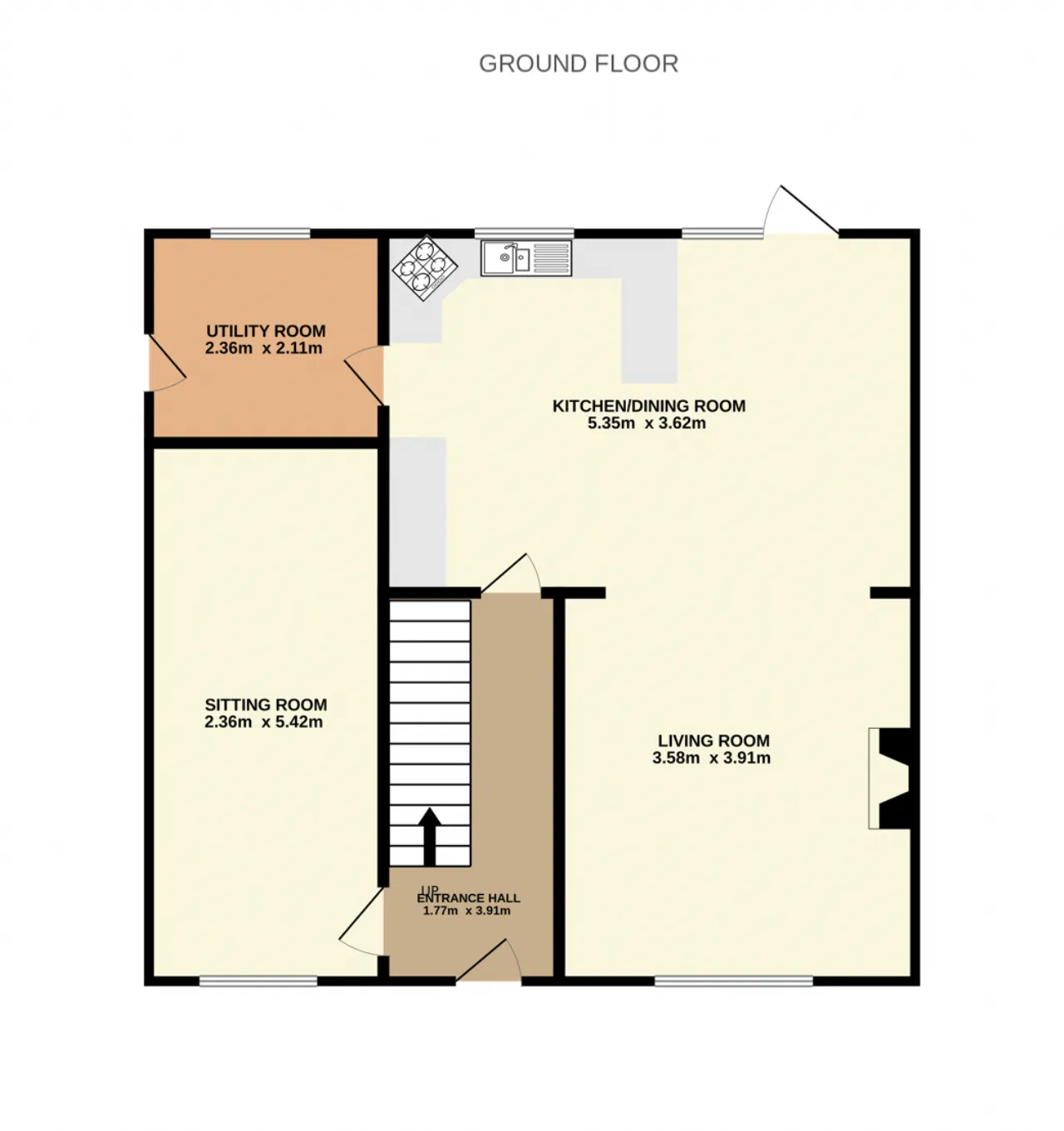 Sitting Room 2.36m x 5.42m The sitting room is situated at the front of the property and features engineered wood flooring, ceiling light fixture, an electric fire, and a large window to the front of the property.