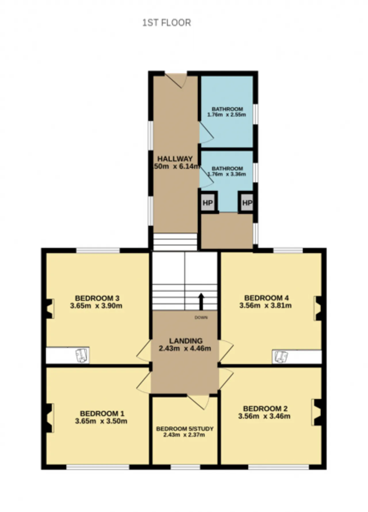 Landing 2.4m x 4.46m The landing provides access to five bedrooms, features a skylight, and includes entry to the attic.