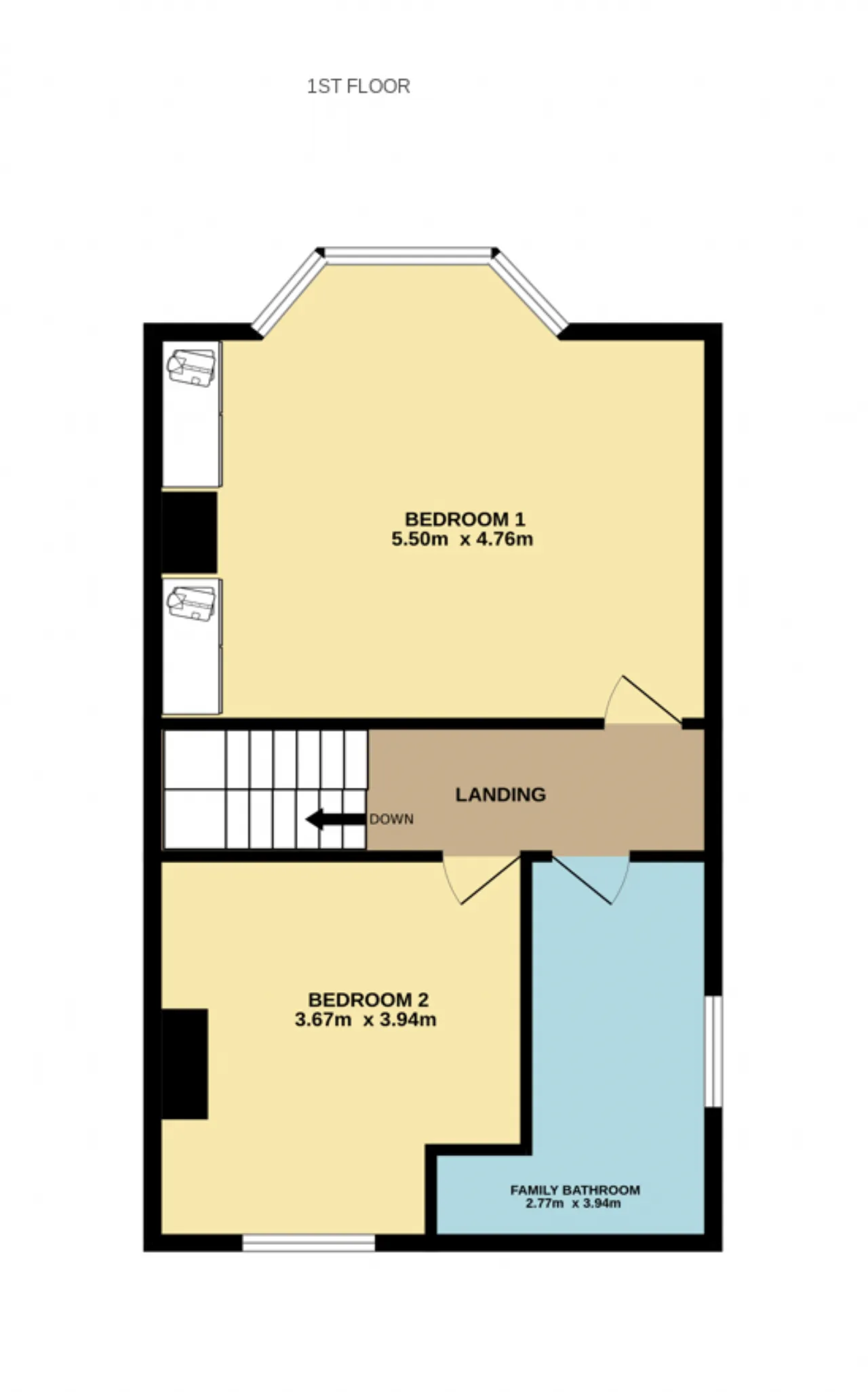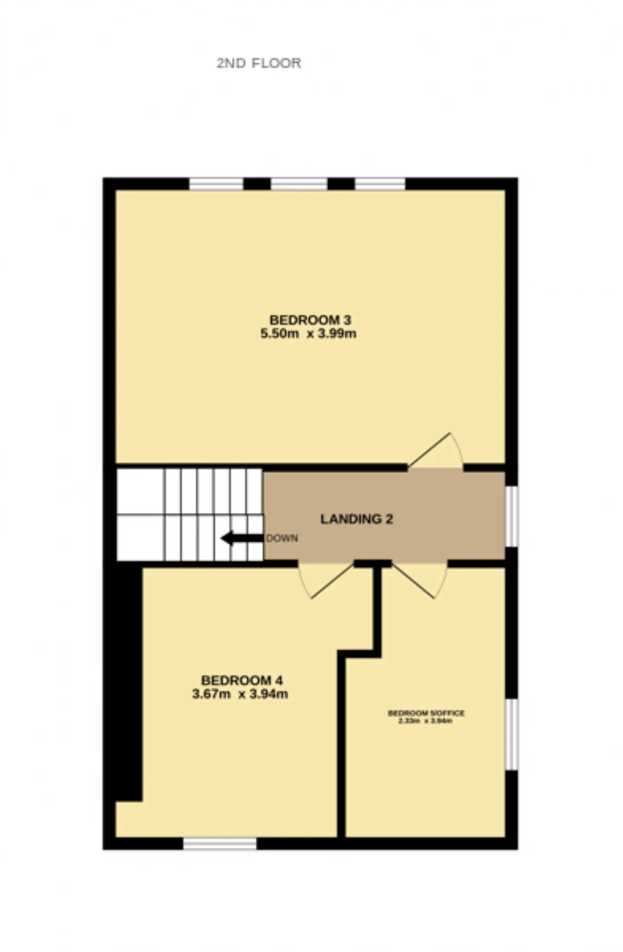 Landing 5.50m x 1.35m The landing provides access to two bedrooms and a bathroom. It features a west-facing sash window that brings in evening light and includes a second staircase leading up to the top floor.