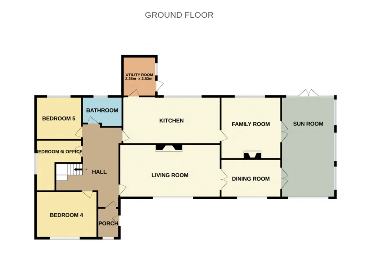Moving inside, the generously proportioned accommodation consists of a porch, entrance hall, kitchen, utility, living room, dining room, family room, conservatory, bathroom, two double bedrooms and an office / study on the ground floor. Overhead, there are three double bedrooms and bathroom. The main bedroom enjoys a large walk-in wardrobe and en-suite.