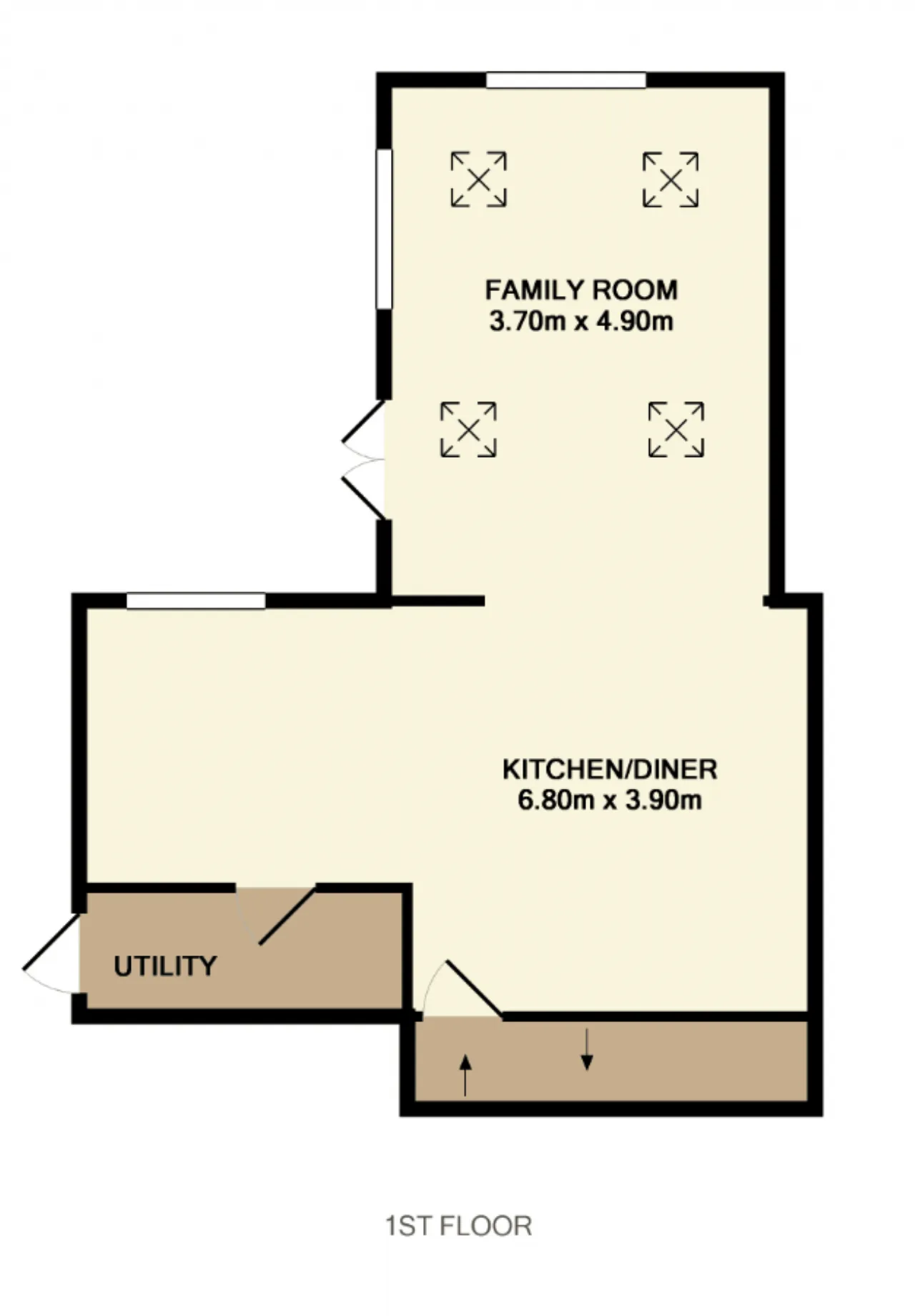 Family Room Solid beech wooden flooring, 4 velux windows and french doors accessing rear garden.