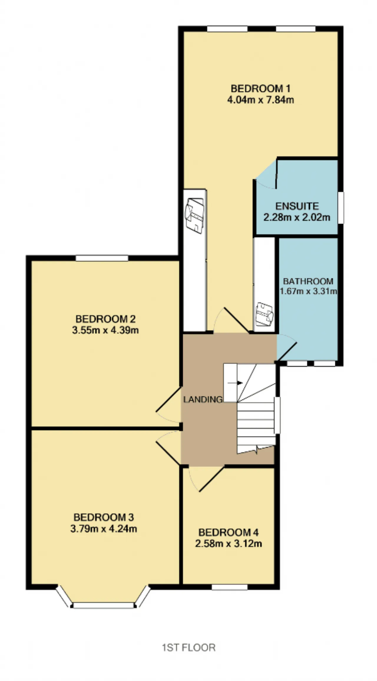 Bedroom 1 4.04m x 7.84m Double room to rear, dressing area with fitted wardrobes, picture rail and recessed lighting.