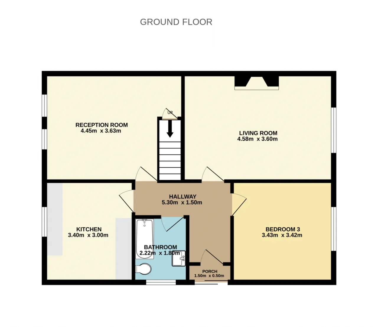 Bedroom 3 3.44m x 3.41m A third double bedroom with carpet flooring, situated on the ground floor of the house.