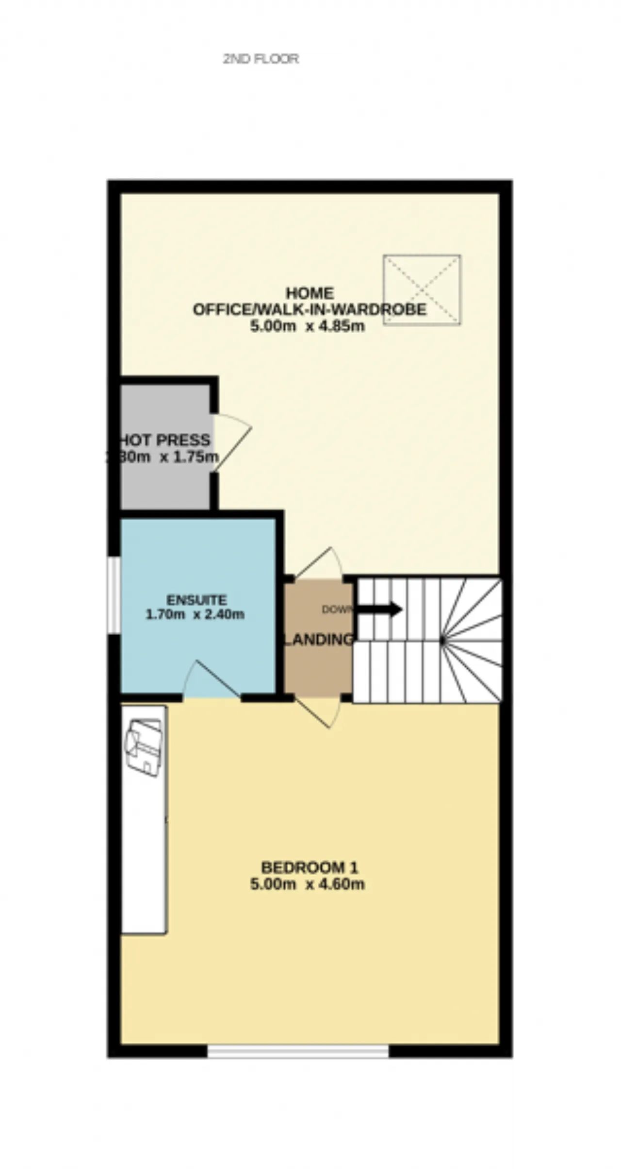 Second Floor: Large main bedroom with ensuite, and spacious home-office / walk-in wardrobe.