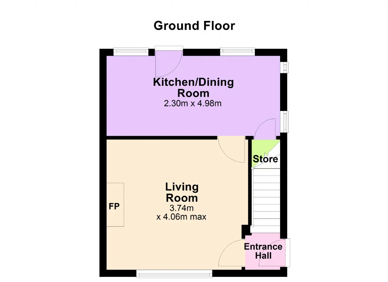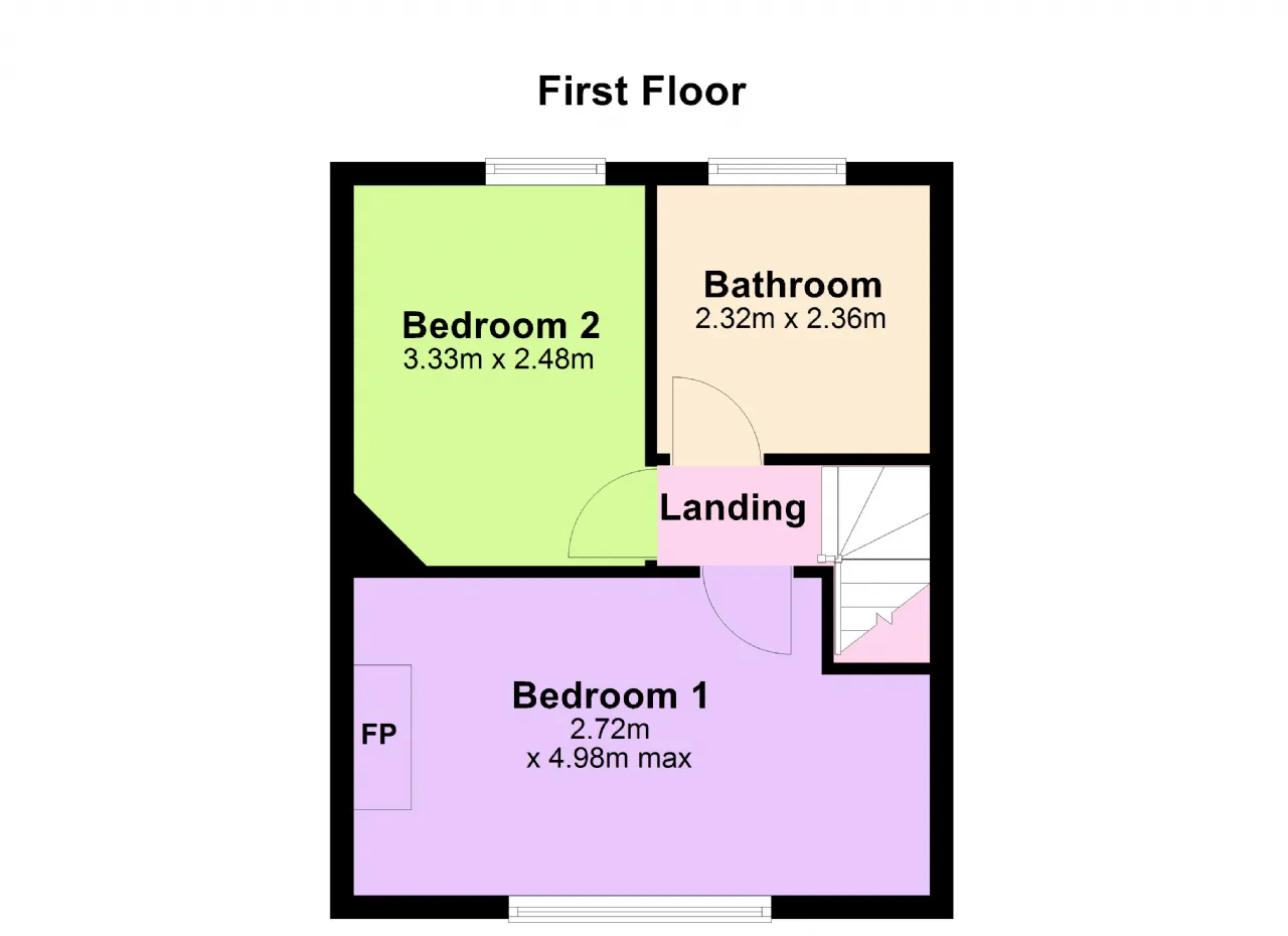 Bedroom 1 2.72m x 4.98m Spacious double with feature fireplace, built-in shelving, and large store cupboard.