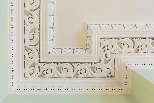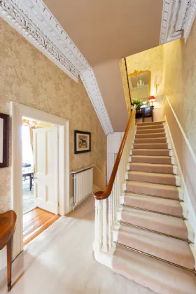 Entrance Hall: beautifully appointed hall with stunning ornate ceiling cornice and centre roses and stained glass window to the side.