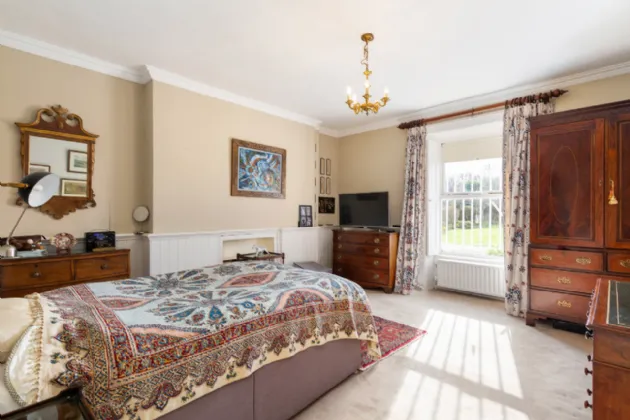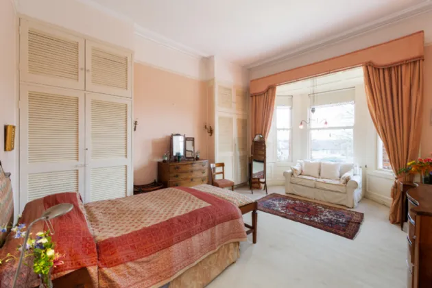 Bedroom 6: double bedroom with ceiling cornice and half wall panelling. Sash window with original shutters overlooks the garden.