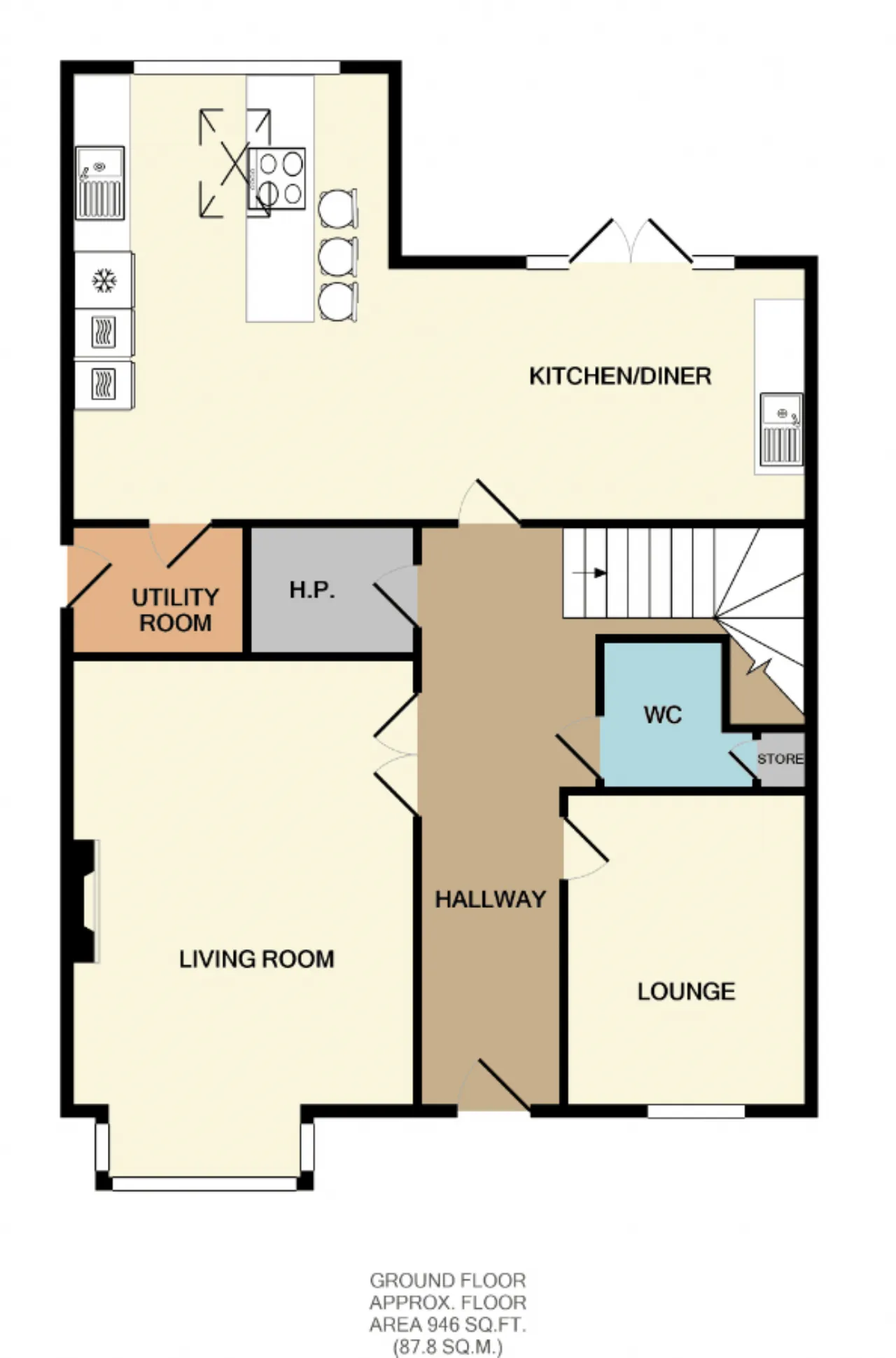 Guest Wc 2.35m x 1.75m Wc, wash hand basin, large under stairs storage with ample shelving.