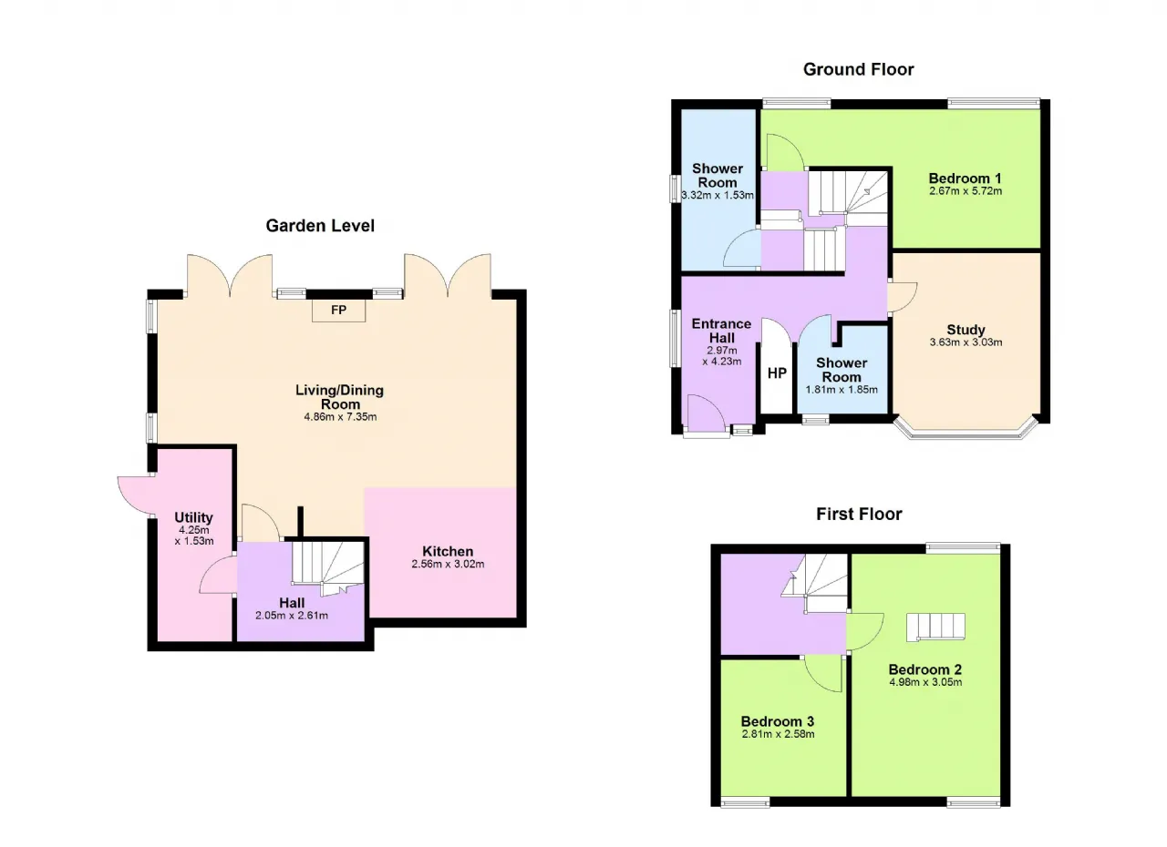 Internally the accommodation briefly comprises of a light filled entrance hall, a use as you will family room / study and a shower room. The open plan kitchen / living room is beautifully appointed with two patio doors opening onto the rear garden. The upper level of the home provides three bedrooms (two double bedrooms and a large single) along with a modern family shower room with a large walk-in shower unit.