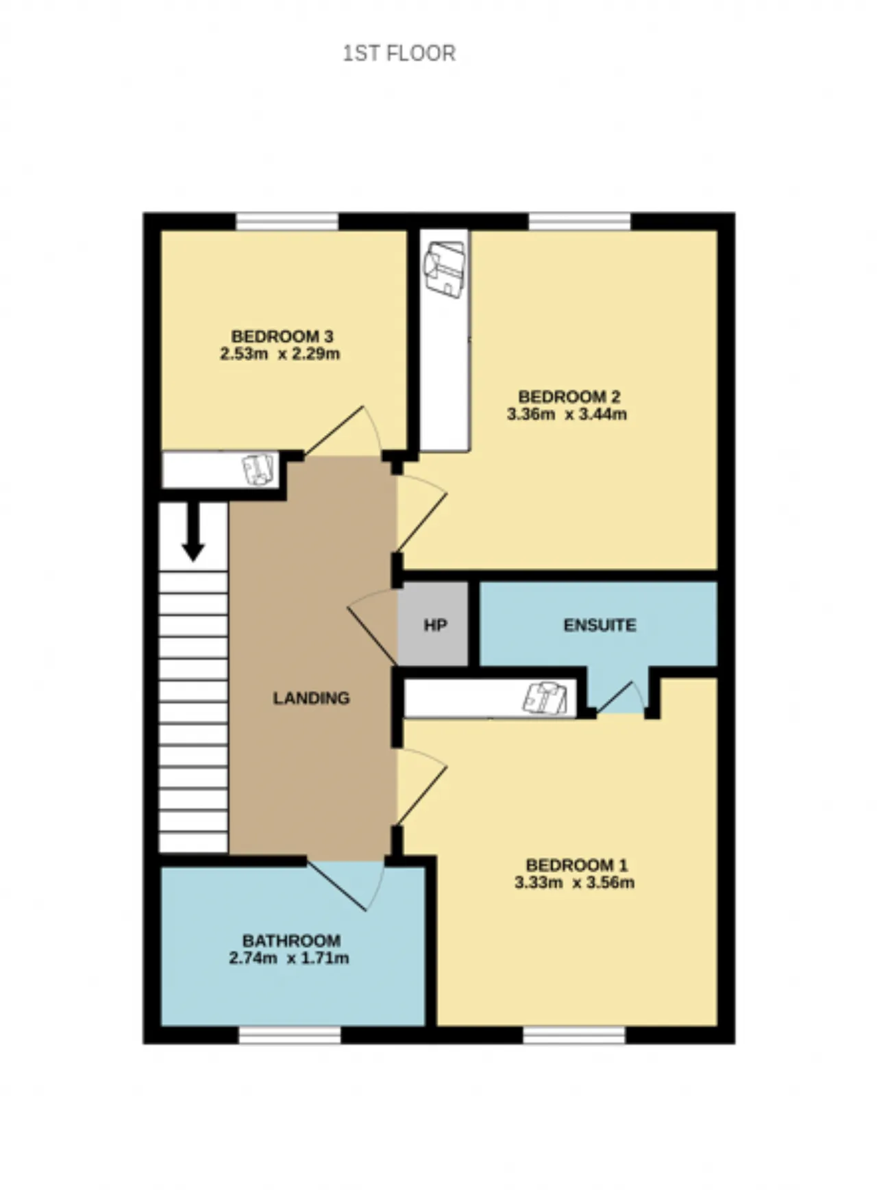 Bedroom 1 3.33m x 3.56m Double bedroom with carpet flooring, fitted wardrobes and window to front.