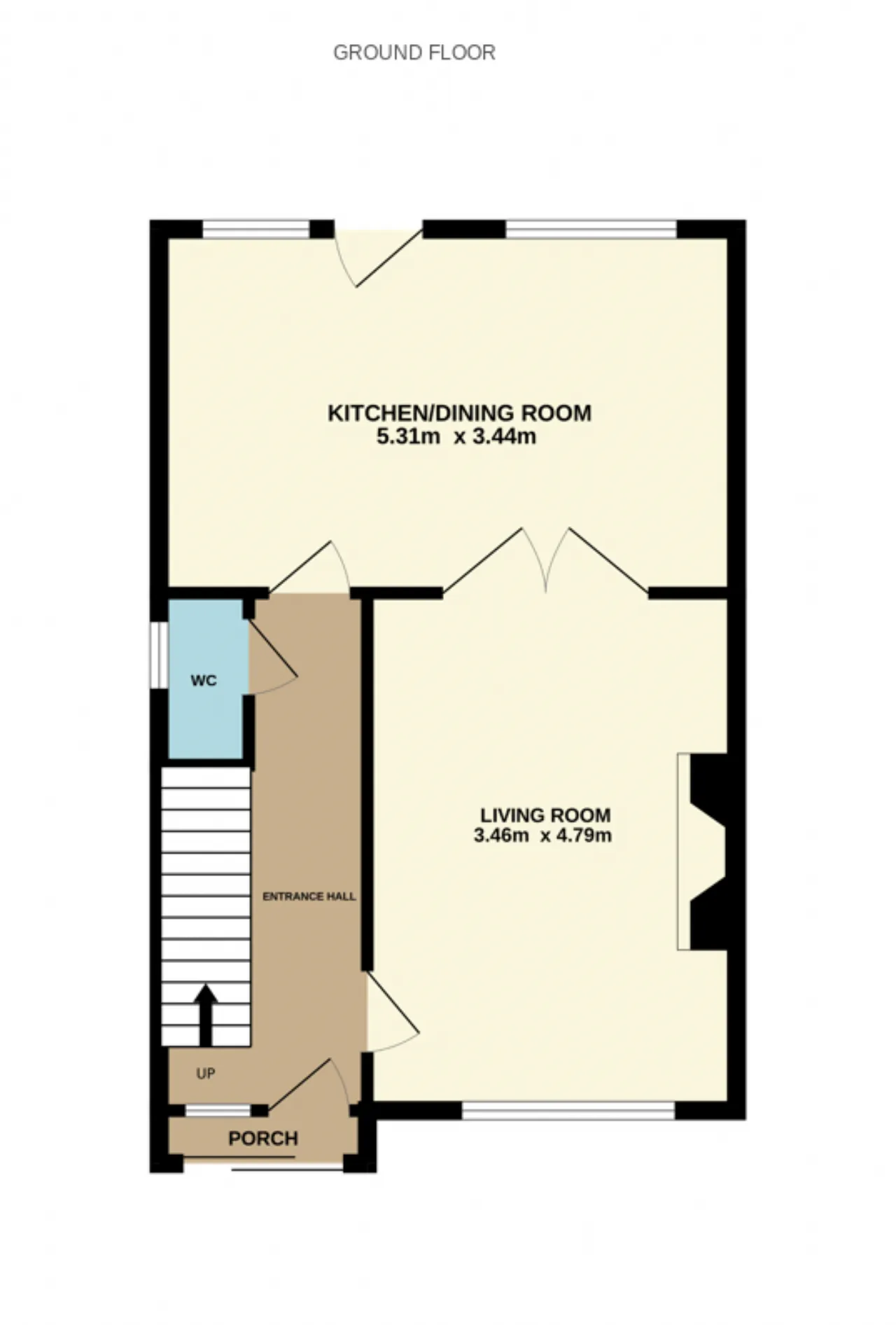 The living room provides a spacious and comfortable setting, while the adjoining kitchen/dining area is well-lit and efficiently laid out, offering ample storage and direct access to the rear garden. A guest WC completes the ground floor accommodation.