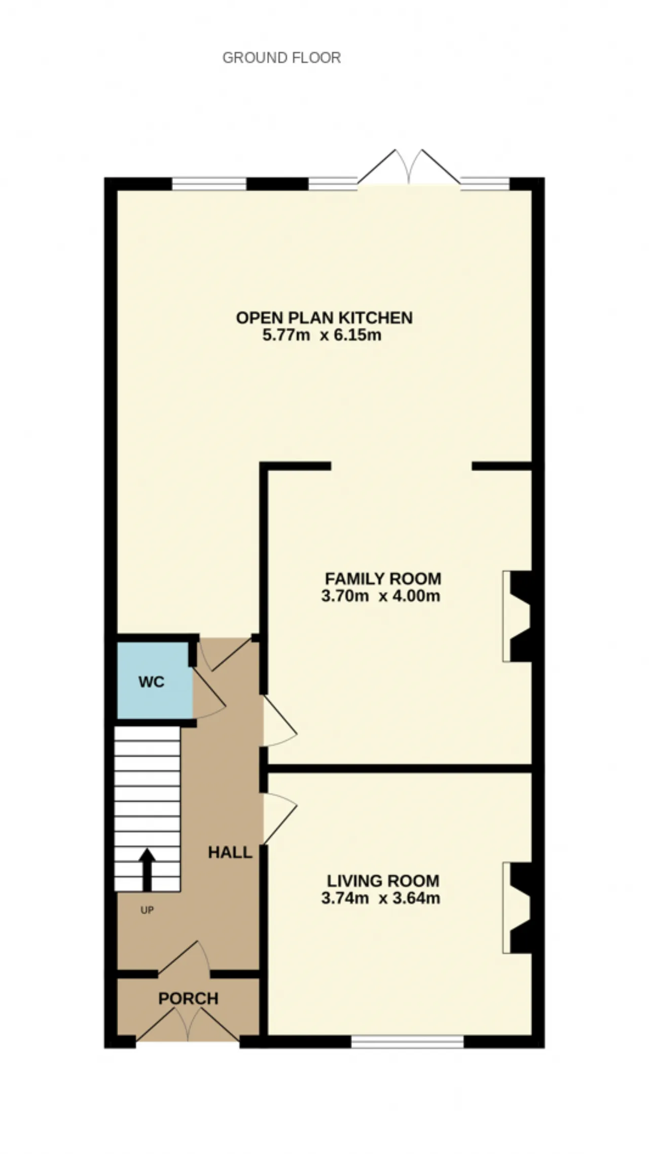 Open Plan Kitchen 5.77m x 6.15m Light filled open plan kitchen and dining area, wood flooring, shaker style kitchen with a range of fitted units and Island with quartz countertops. Fitted with double oven, microwave, gas hob, extractor fan, dishwasher and plumbed for washing machine.