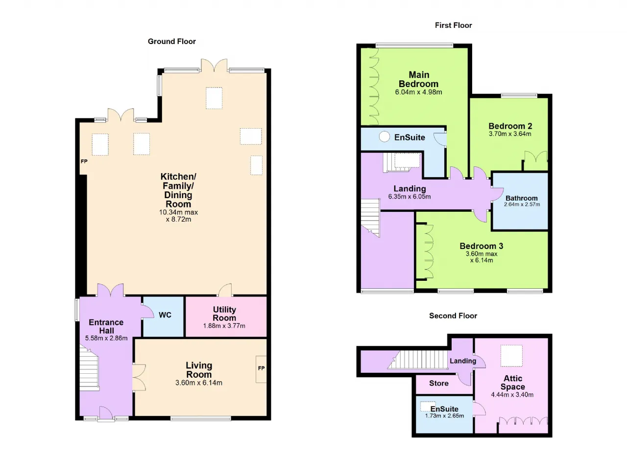 En-suite 1.73m x 2.65m tiled floor, wall mounted heated towel rail, w.c., w.h.b., step in shower cubicle, access to under eaves storage