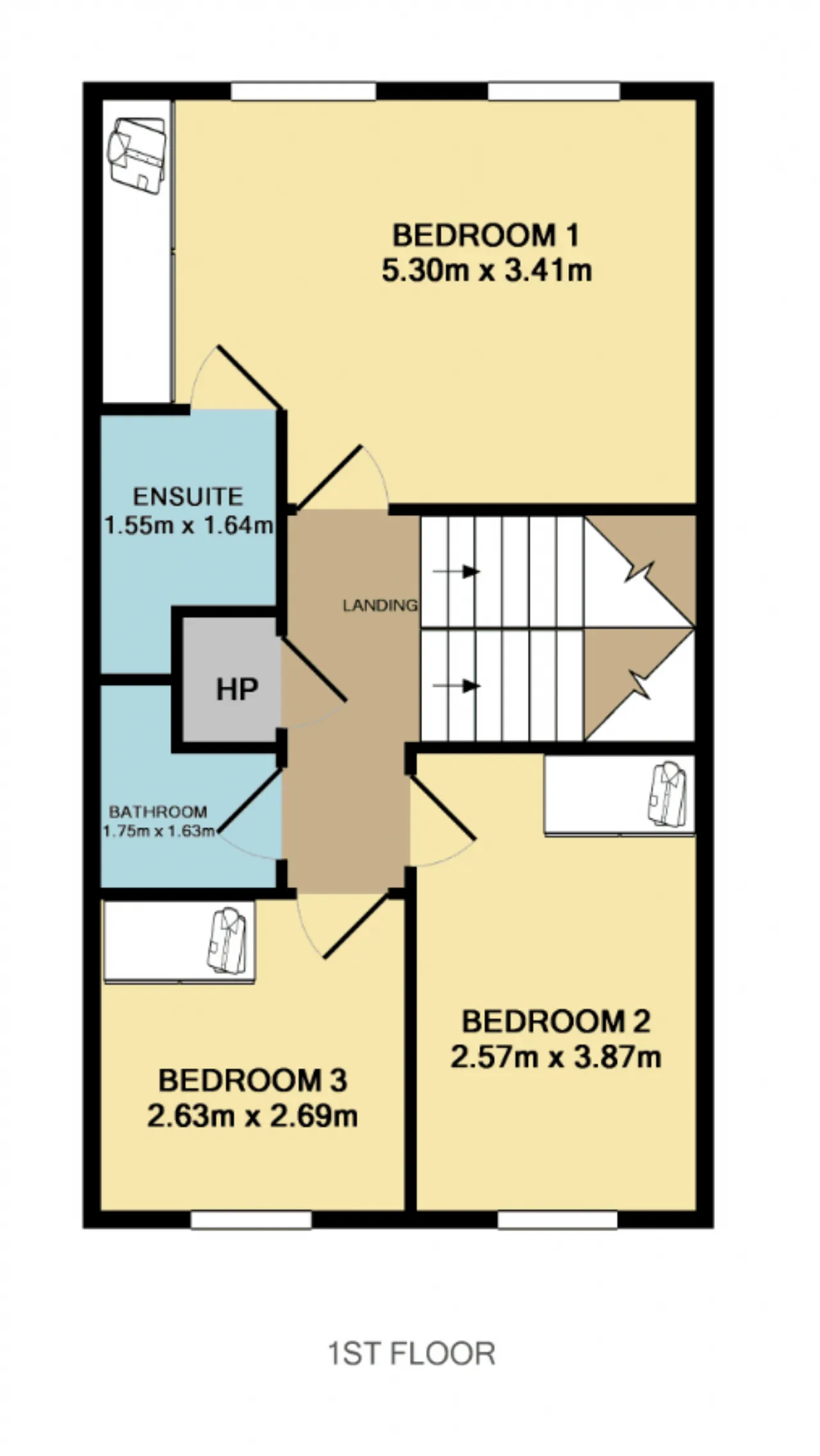 Ensuite 1.55m x 1.64m Fully tiled floor to ceiling height, heated towel rail, pedestal wash hand basin with mixer tap, WC, vanity mirror, shower cubicle with built-in shower.