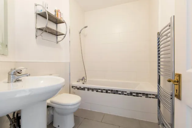 Bathroom With tiled floor, partially tiled walls, bath with shower attachment over, wc, wash hand basin, heated towel rail, extractor fan,