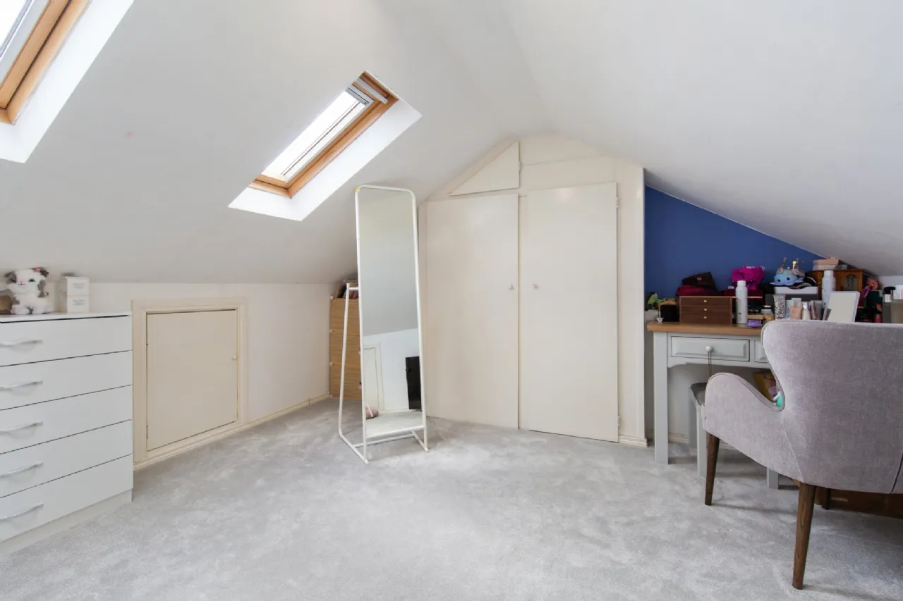 Attic Room 3.82m x 5.71m With 3 Velux roof lights, excellent under eaves storage and fitted wardrobes