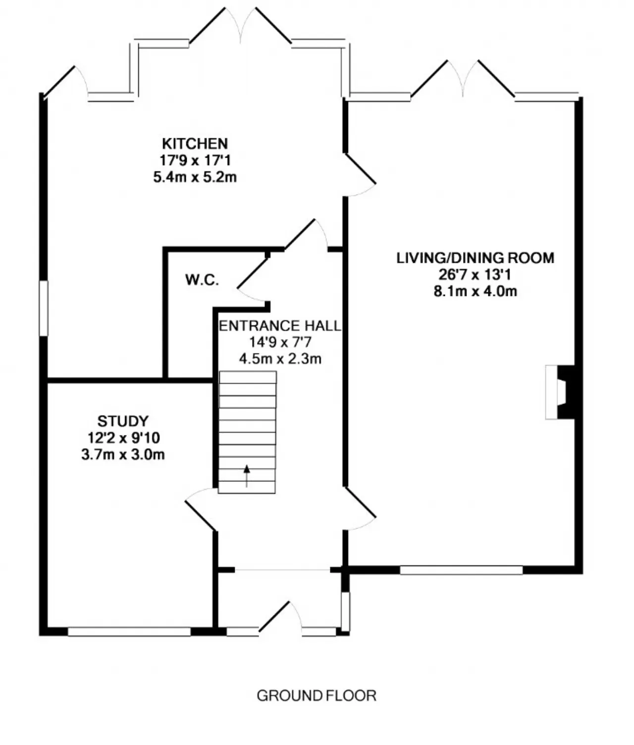 Living/ Dining Room 8.1m x 4.0m Beautiful dual-aspect room with box bay window, ceiling coving, spot lighting, stone open fireplace and hearth and double doors to the garden.