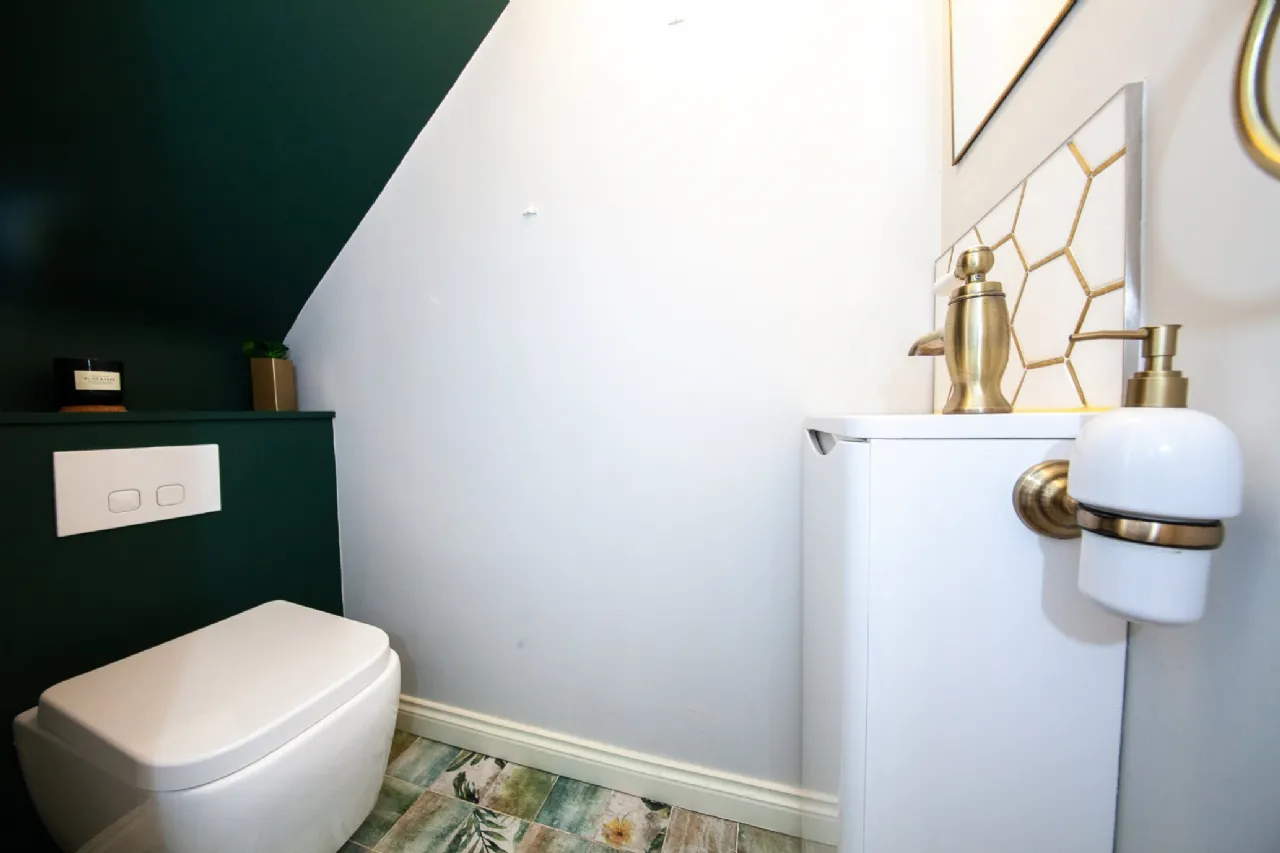 Guest WC 0.79m x 1.77m With wc, sink set in to vanity unit with tiled splash back, extractor fan