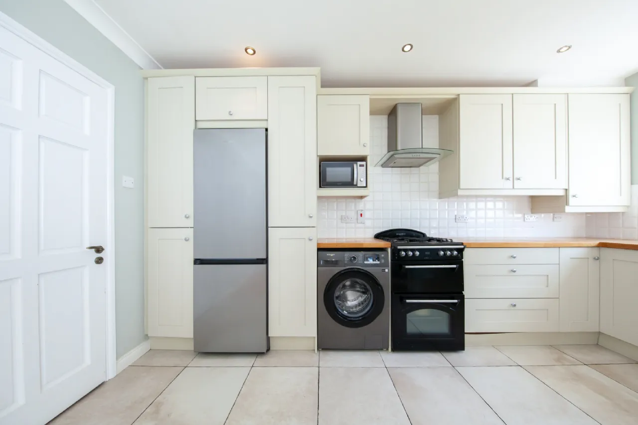 Kitchen Shaker style kitchen, tiled floor, tiled splash backs, Gourment classic cooker with extractor oven, Belfast sink, window to rear, door to press housing Worchester gas boiler with digital controls and recessed lighting,