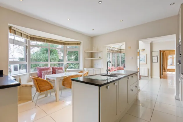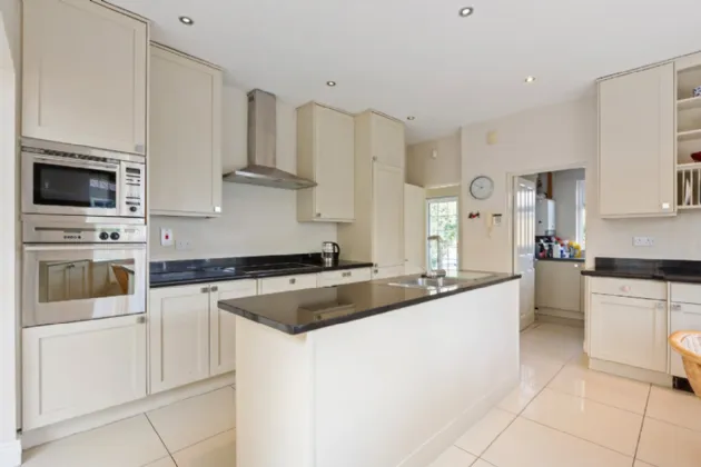 Kitchen/ Family/ Sun Room 4.87m x 4.19m Tiled floor, recessed lighting, hand painted kitchen units, Neff electric hob, Neff integrated microwave, Neff oven, Bosch integrated dishwasher, 1 1/2 stainless steel sink units and drainer, ample storage, black countertops, bay window with window seat, double doors out to garden patio and pitched glass ceilling bringing in lots of light. stairs to upstairs and double doors to living room.