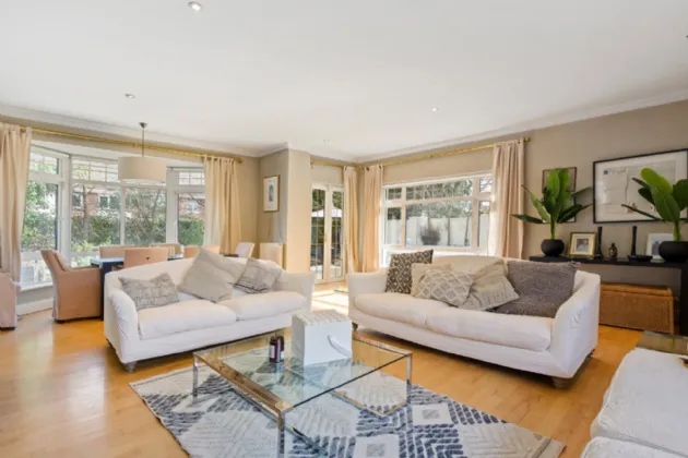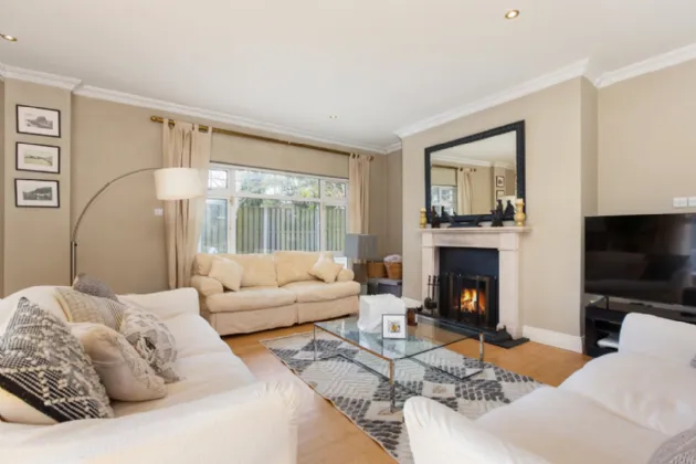 Living Room 7.86m x 6.38m Semi solid wooden floors, triple aspect over gardens, recessed lighting, ceiling coving, door to patio area. Open fireplace with black hearth, surround and marble mantle, bay window overlooking patio area.