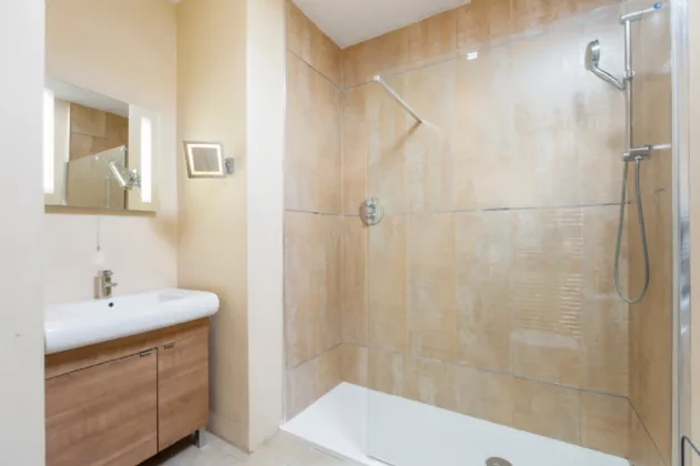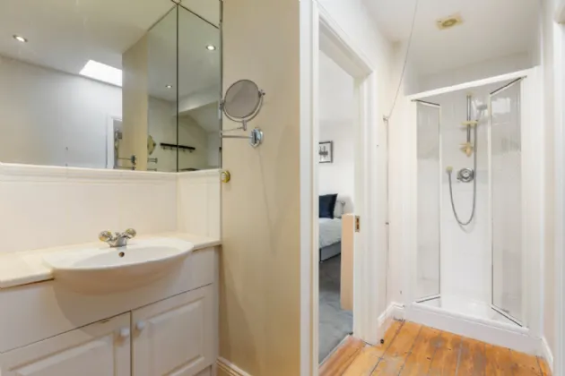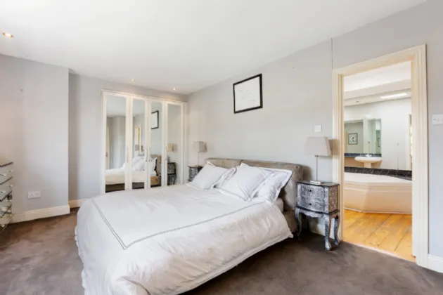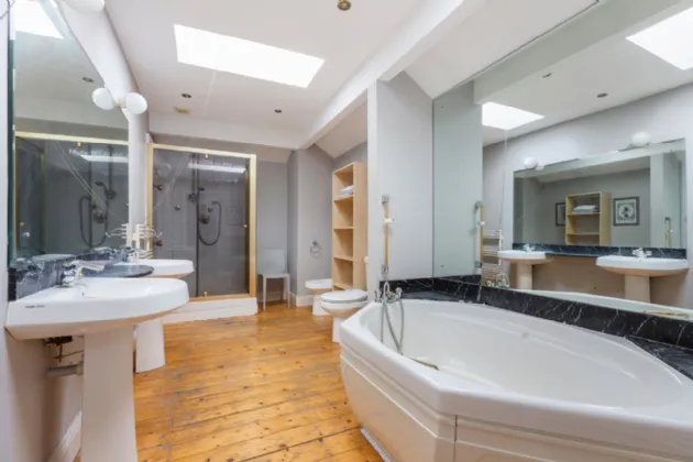 En suite 2.38m x 4.82m Wooden flooring, Velux rooflight, double wash hand basins, marble countertop and splashback, fitted mirror, heated towel rail, bidet, wc, bath, large fitted wall mirror, separate shower, fully tiled around shower.
