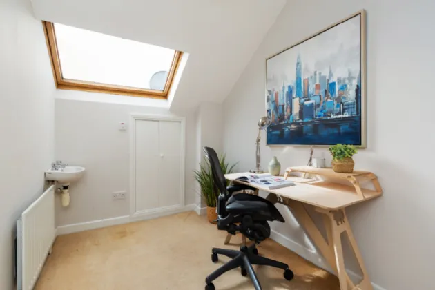 A spiral staircase from the landing brings you up to the converted attic space. This area is divided into two separate rooms, both flooded with natural light from the Velux roof lights. It also has ample eaves storage at the sides.