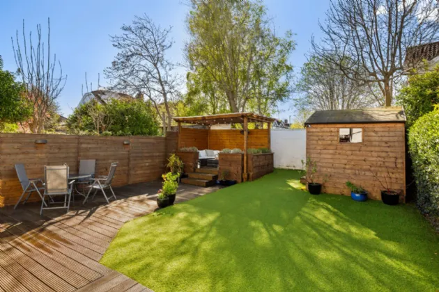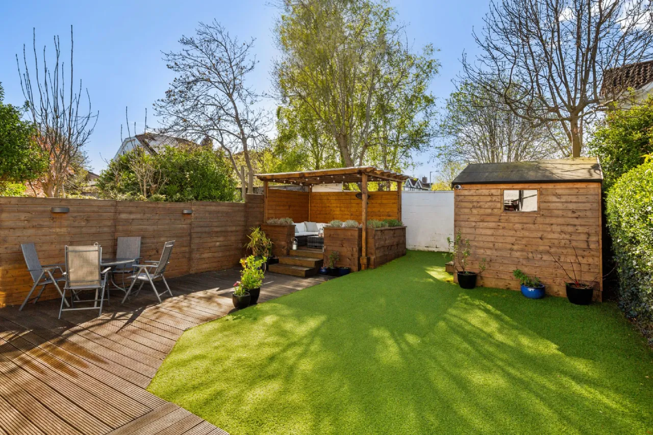 Outside there is a lovely private sunny south facing rear garden with large decking area providing ample space for outdoor dining. There are steps up to a raised pergola with multiple outdoor sockets - the perfect spot to relax and enjoy the evening sunshine. Outdoor garden lighting creates a wonderful evening ambience. A wooden Barna shed provides outdoor storage and there is an outside tap. To the front there is a gravelled driveway providing off-street parking.