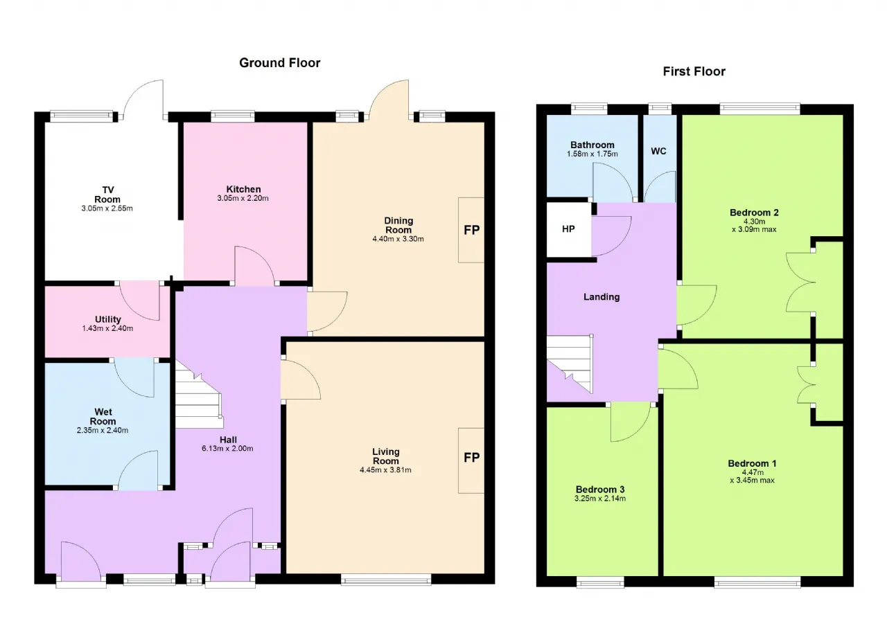 Bedroom 1 4.47m x 3.45m A generous sized double bedroom with fitted wardrobes and a window overlooking the front garden.