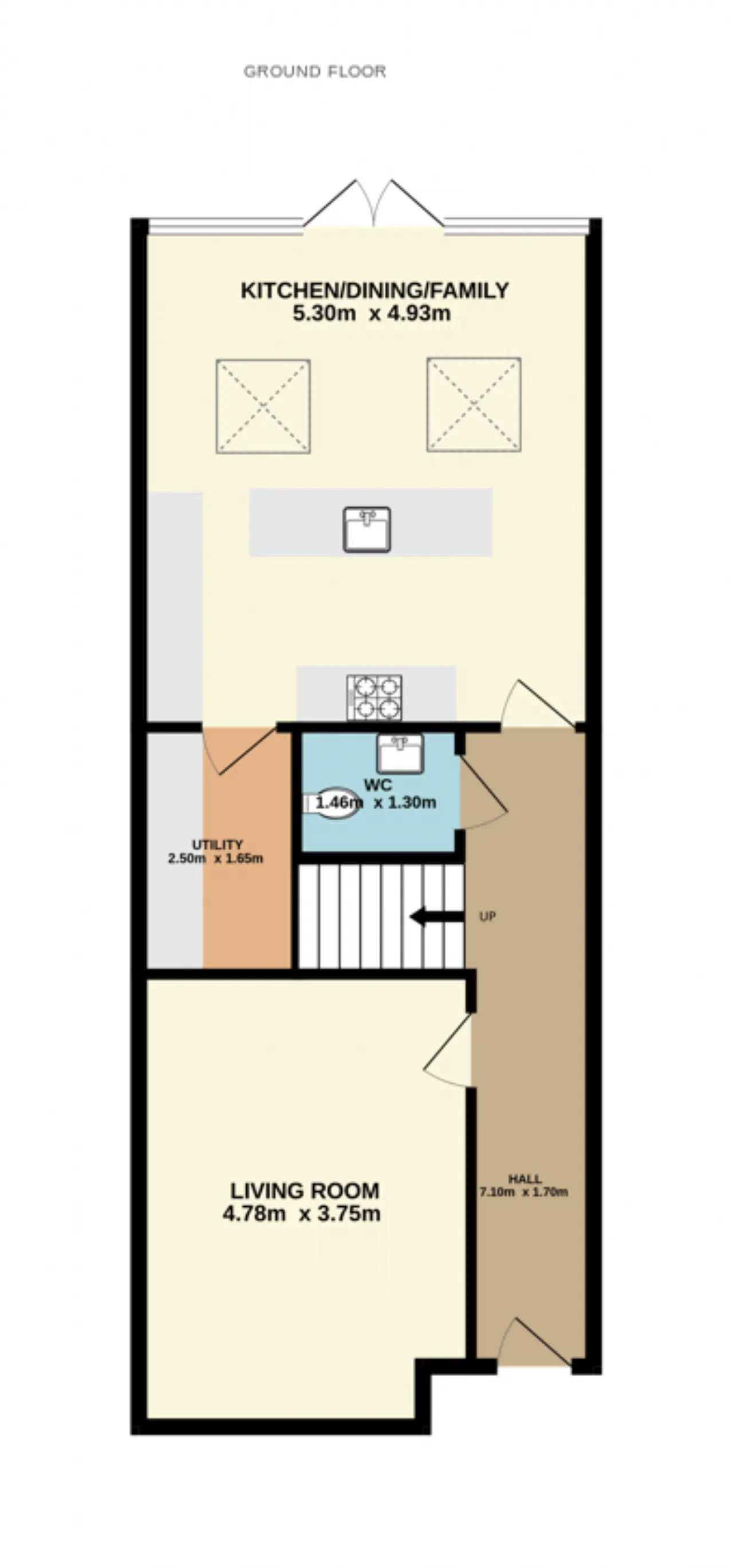 Kitchen/Dining/Family Room 5.3 x 4.9 Located to the rear of the property this versatile, open plan area combines kitchen, dining and family room. This stunning space takes full advantage of the property’s South/West facing aspect and is flooded with natural light. The kitchen area offers wall and floor fitted storage units, quartz counter tops, integrated Electrolux oven, integrated four ring gas hob, integrated Electrolux fridge freezer, brushed chrome sockets and switches, this island is another lovely feature to this space it offers further storage, integrated dishwasher, stainless steel sink and quartz countertop, recessed feature lighting, 2 x Velux windows and Walnut timber flooring. Double doors open out to the garden area/patio area.